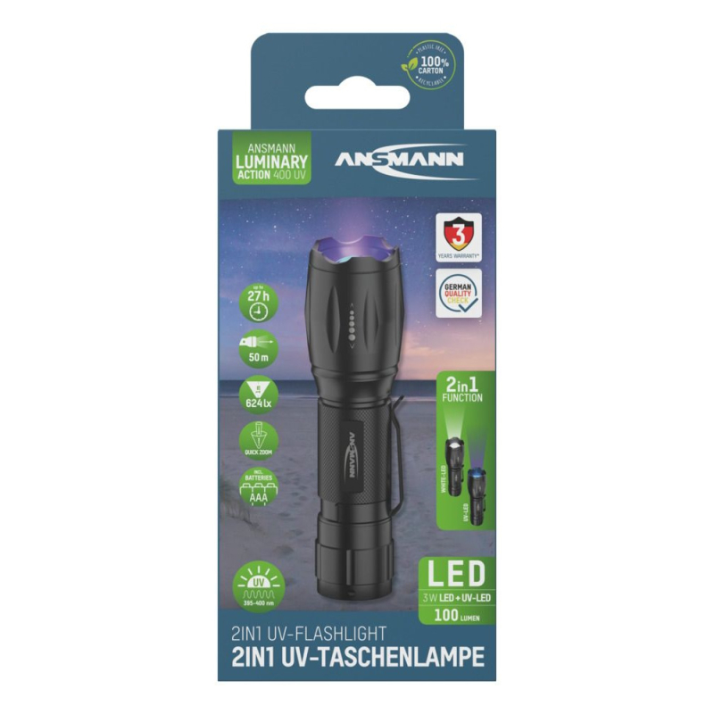 Ansmann 3W LED verlichting met UV LED lamp. De professionele UV-zaklamp van ANSMANN overtuigt door zijn ideale proporties en antislip buitenkant. Dankzij de schakelaar op de eindkap is de lamp ideaal voor direct gebruik, zelfs met één hand.Uitgerust met de nieuwste ledtechnologie kan hij traploos worden gefocust door de lampkop te draaien – van een nauwkeurig lichtpunt tot een homogene breedstraler. De nieuwe Action 400 UV is uitgerust met vier lichtfuncties: volledige helderheid (100 lumen), energiebesparende modus (30% helderheid bij 30 lumen), stroboscooplicht en UV-licht. De batterijen gaan ongeveer 8 uur mee in de 100%-modus en 27 uur in de energiebesparende modus.Met zijn 395-400 nm sterke UV-licht kan de Action 400 UV op veel gebieden worden gebruikt, zoals bij het zoeken naar barnsteen aan de Noordzee- en Oostzeekust, bij hygiëne- en netheidscontroles in hotels en vakantiehuizen en bij het zoeken naar aas tijdens het vissen.Technische Details :- LED : 3 watt LED- Levensduur LED : > 50000 uur- Helderheid : 4200 Lux- Lumen : 100- Mode 1 : 100 procent (100 lumen)- Mode 2 : 30 procent (8 uur, 30 lumen)- Mode 3 : Strobe- Mode 4 : UV- Tijdsduur bij volle accu : 2,5 uur- Batterij (excl.): 3 x Micro AAA /LR03 Alkaline- Behuizing : Aluminium + ABS + PC