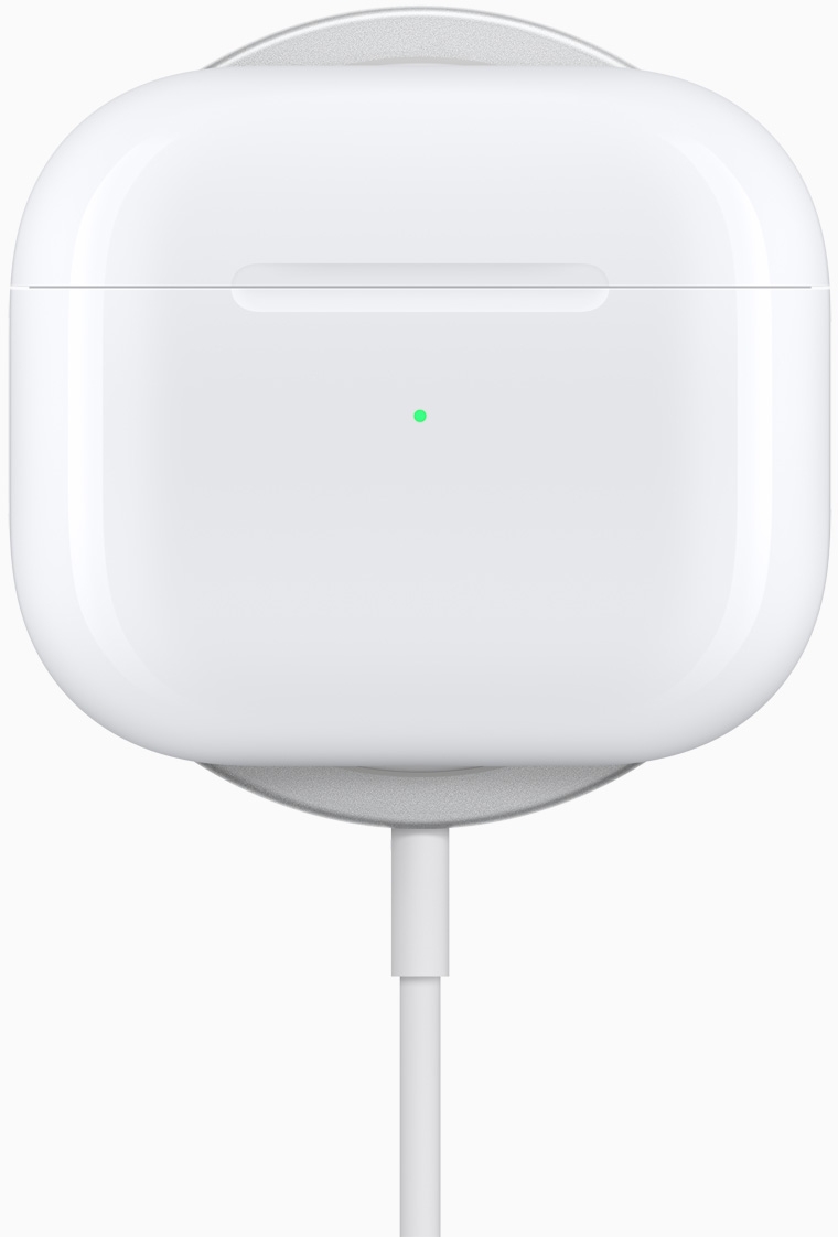 Het opladen van de oplaadcase kan nu draadloos en moeiteloos op een MagSafe-oplader. Volledig opgeladen is de case goed voor tot wel 30 uur luistertijd. En laad je je AirPods 5 minuten op in de case, dan kun je al een uur luisteren.