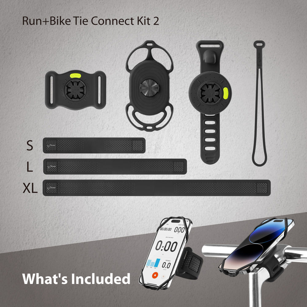 Het bevestigingssysteem van de Bike Tie maakt snelle montage en demontage van je smartphone mogelijk, ideaal tijdens het fietsen. Het is compatibel met ronde en vierkante buizen van verschillende afmetingen, waardoor het past op vrijwel elke fiets. De hoge elastische riemen kunnen moeiteloos telefoons van 4,7 tot 7,2 inch van alle merken vasthouden. Aan de andere kant biedt de Run Tie Connect 2 een comfortabele, op maat gemaakte pasvorm voor je arm. Hij wordt geleverd met drie soorten elastische banden die geschikt zijn voor een armbereik van 18 tot 62 cm. En geen zorgen over zweet, je kunt de elastische banden eenvoudig verwijderen om ze apart te wassen.
