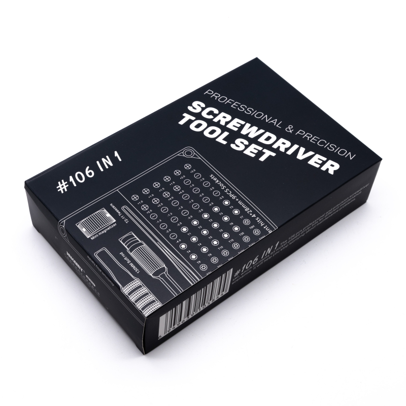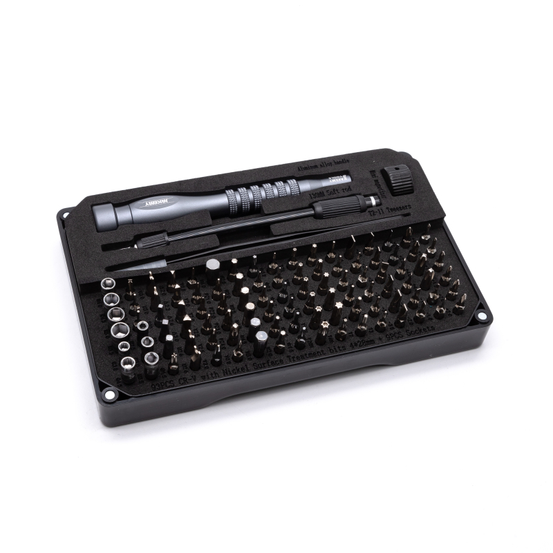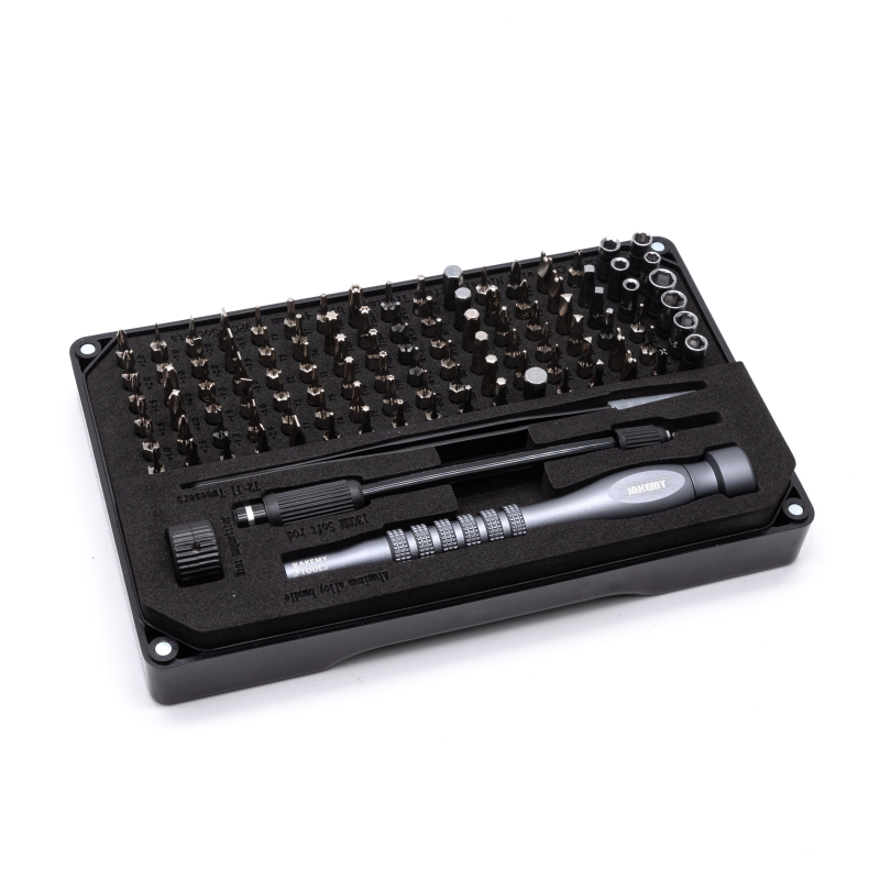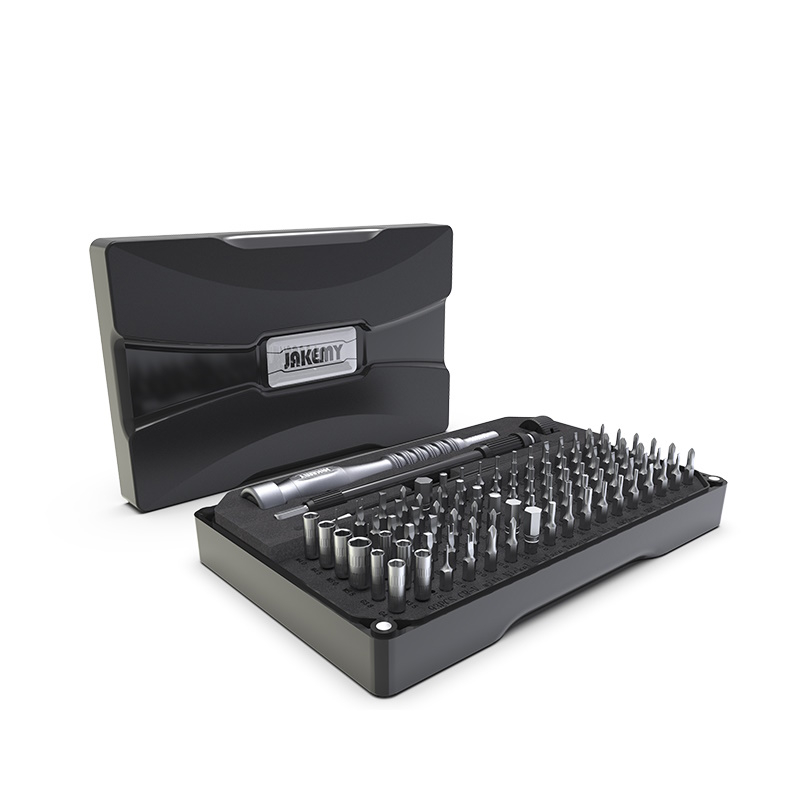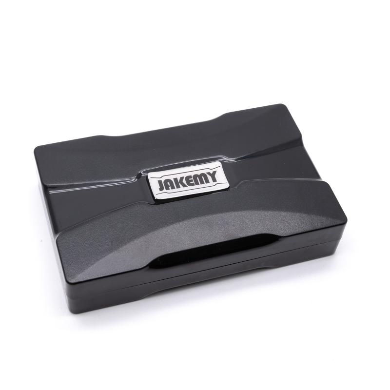 Jakemy JM-8177 106 in 1 Gereedschapsset- Non-slip ergonomische handgreep- Flexibel verlengstuk voor diep gelegen schroeven- Magnetische ring voor magnetiseren van de tips- Pincet (anti-statisch) T2-11- 102 bitsDit alles in een nette stevige behuizing met magnetische sluitingvernikkelde bits H4*28mm:Bus: M2.5 M3.0 M3.5 M4.0 M4.5 M5.0 M5.5 G3.8 G4.2Torx: T1 T2*2 T3*2 T4*2 T5*2 T6 T7 T8 T9 T10 T15 T20Hex: H0.7 H0.9 H1.3 H1.5 H2.0 H2.5 H3.0 H4.0 H4.5 H5.0 H6.0Boor : T6H T7H T8H T9H T10H T15H T20HPozidrive : PZ1.0 PZ2.0 PZ3.0 PZ4.0Sim-kaart pin : 0.8 1.0Afstand : 1.5*2Driehoekig : 2.0 2.3 2.6 3.0Platte-kop: 1.0*2 1.3*2 1.5*2 2.0*2 2.5*2 3.0*2 3.5*2 4.0Pentagon (Pentalobe): 0.8*2 1.2*2 1.5*2 2.0Phillips: 1.0*2 1.5*2 2.0*2 2.5*2 4.0*23-zijdig: Y0.8*2 Y2.0*2 Y2.5*2 Y3.0U-vormig: U2.6*2 U3.0*2- Alumintum bithouder met extra grip- Pincet (anti-statisch) T2-11- 130mm flexibel verlengstuk- H4 4/1 connector
