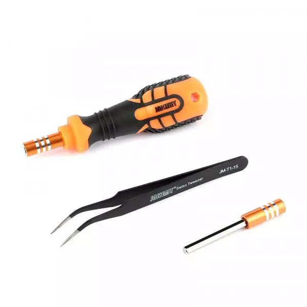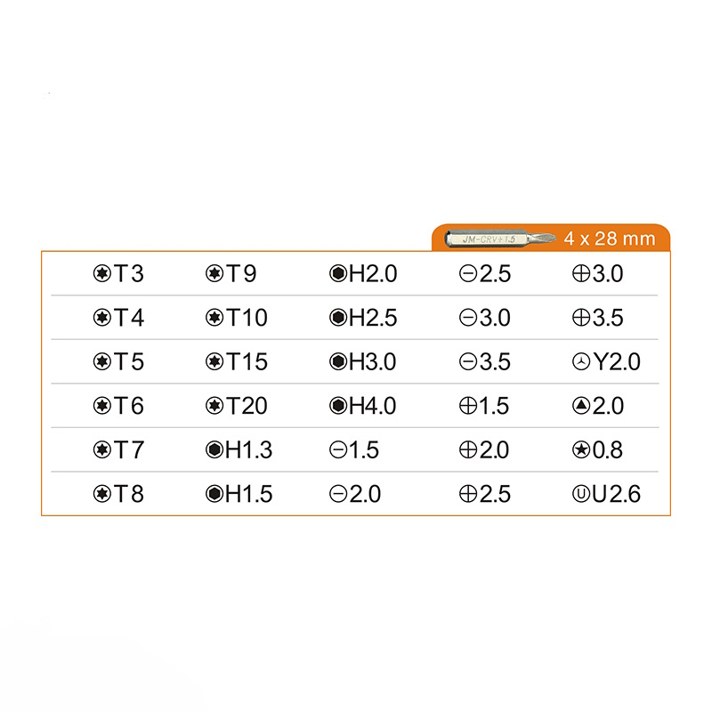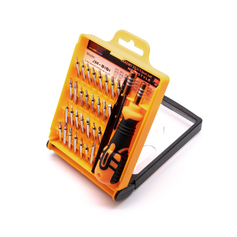 Jakemy JM-8101 33 in 1 Gereedschapsset- Non-slip ergonomische handgreep- Verlengstuk voor diep gelegen schroeven- Magnetische tips- 30 bits- PincetDit alles in een nette stevige behuizingChroom bits H4*28mm:Torx: T3 T4 T5 T6 T7 T8 T9 T10 T15 T20Hex: H1.3 H1.5 H2.0 H2.5 H3.0 H4.0Platte-kop: 1.5 2.0 2.5 3.0 3.5Pentagon (Pentalobe): 0.8Phillips: 1.5 2.0 2.5 3.0 3.53-zijdig: Y2.0U-vormig: U2.6- Ergonomische handgreep- 115mm Gebogen tip pincet- 60mm verlengstuk