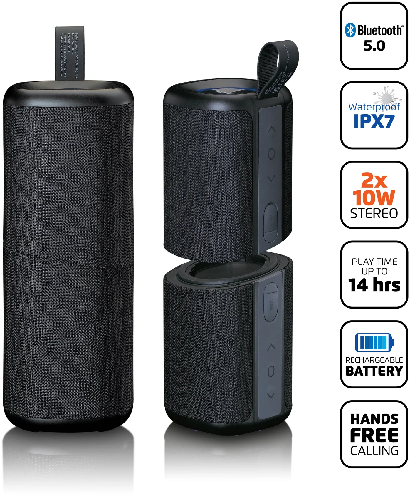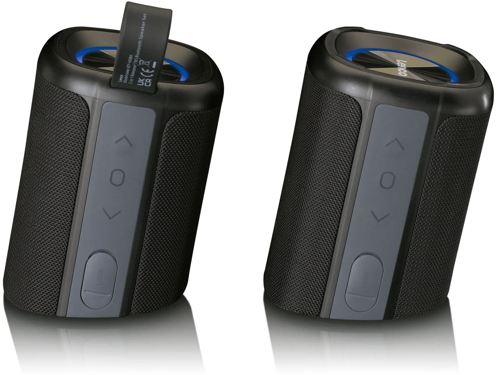 Dankzij de True Wireless Stereo (TWS) functie werken de speakers naadloos samen zonder dat er kabels aan te pas komen. Voor extra sfeer zijn de speakers voorzien van een LED-ring die knippert op het ritme van de muziek. Maak je geen zorgen als het feestje buiten is of naast het zwembad; de Lenco BTP-400BK is waterbestendig met een IPX7-classificatie, waardoor hij zelfs een duik in het water kan overleven.