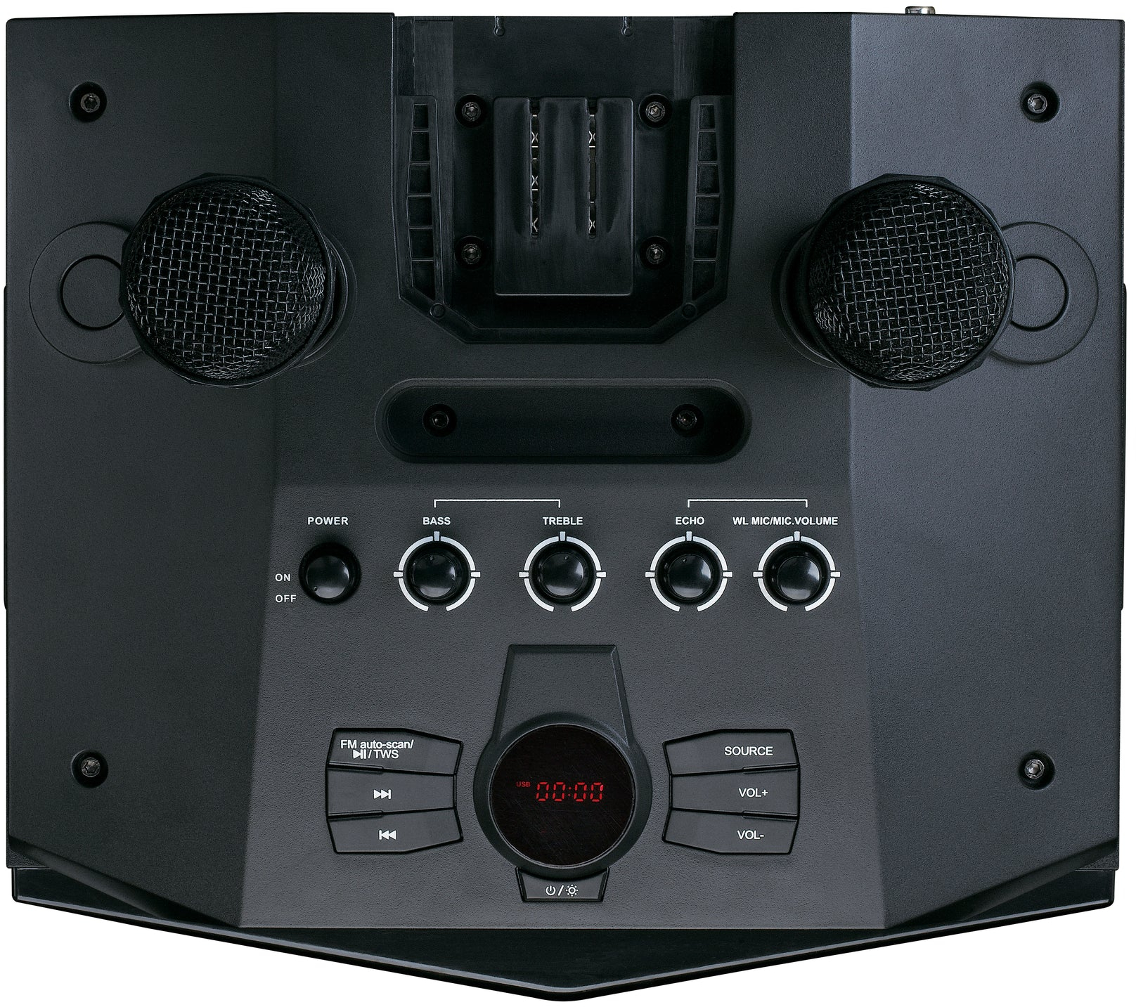 Zing mee met je favoriete nummers dankzij de twee meegeleverde draadloze microfoons. Gebruik de handige microfoonhouders op de speaker om ze op te bergen wanneer je een pauze neemt van je zangcarrière.