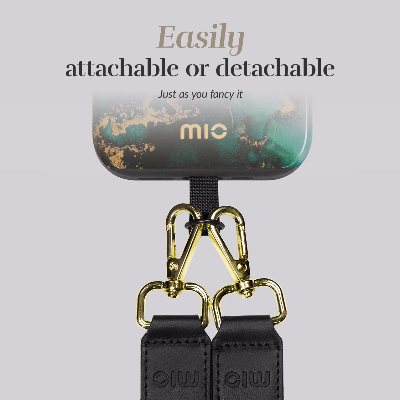 Elke Mio Lanyard is zorgvuldig afgewerkt met elegante leren details, die een vleugje luxe en duurzaamheid toevoegen. De metalen haakjes, ontworpen voor gemak en veiligheid, zorgen ervoor dat je smartphone altijd binnen handbereik is, zonder in te leveren op stijl.