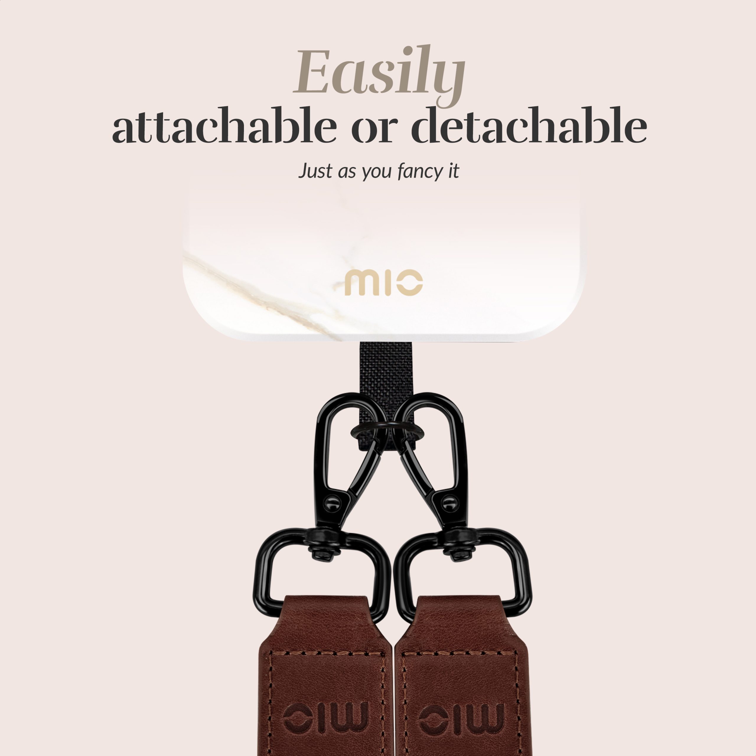 Elke Mio Lanyard is zorgvuldig afgewerkt met elegante leren details, die een vleugje luxe en duurzaamheid toevoegen. De metalen haakjes, ontworpen voor gemak en veiligheid, zorgen ervoor dat je smartphone altijd binnen handbereik is, zonder in te leveren op stijl.