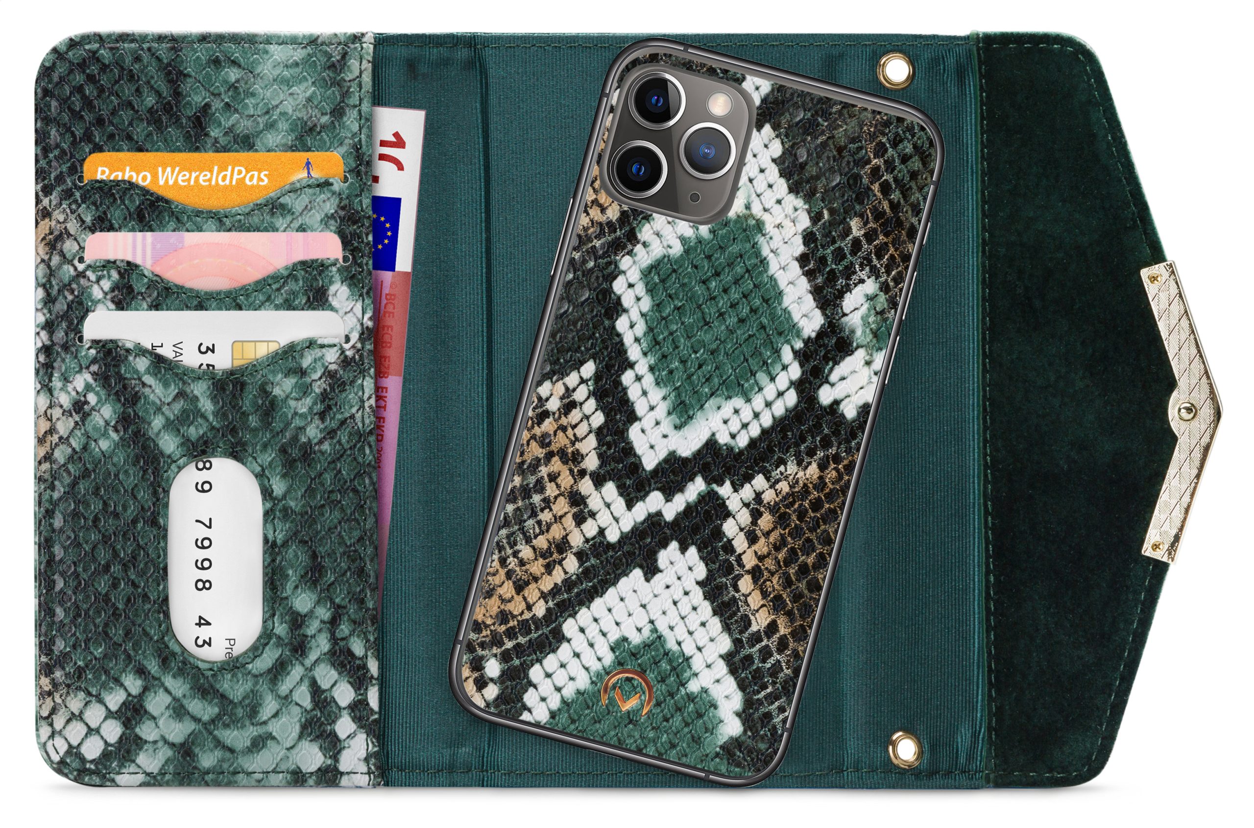 Het gebruik van de verschillende materialen en de hoge mate van afwerking maken de Clutch een unieke case. De buitenkant van de wallet is een combinatie van materiaal met een gedetailleerde slangenleren look en van materiaal met een zachte, luxe fluwele feel. Dit zet zich voort aan de binnenkant, de achterkant van de cover en de handige pols-strap, zodat alles goed bij elkaar past.