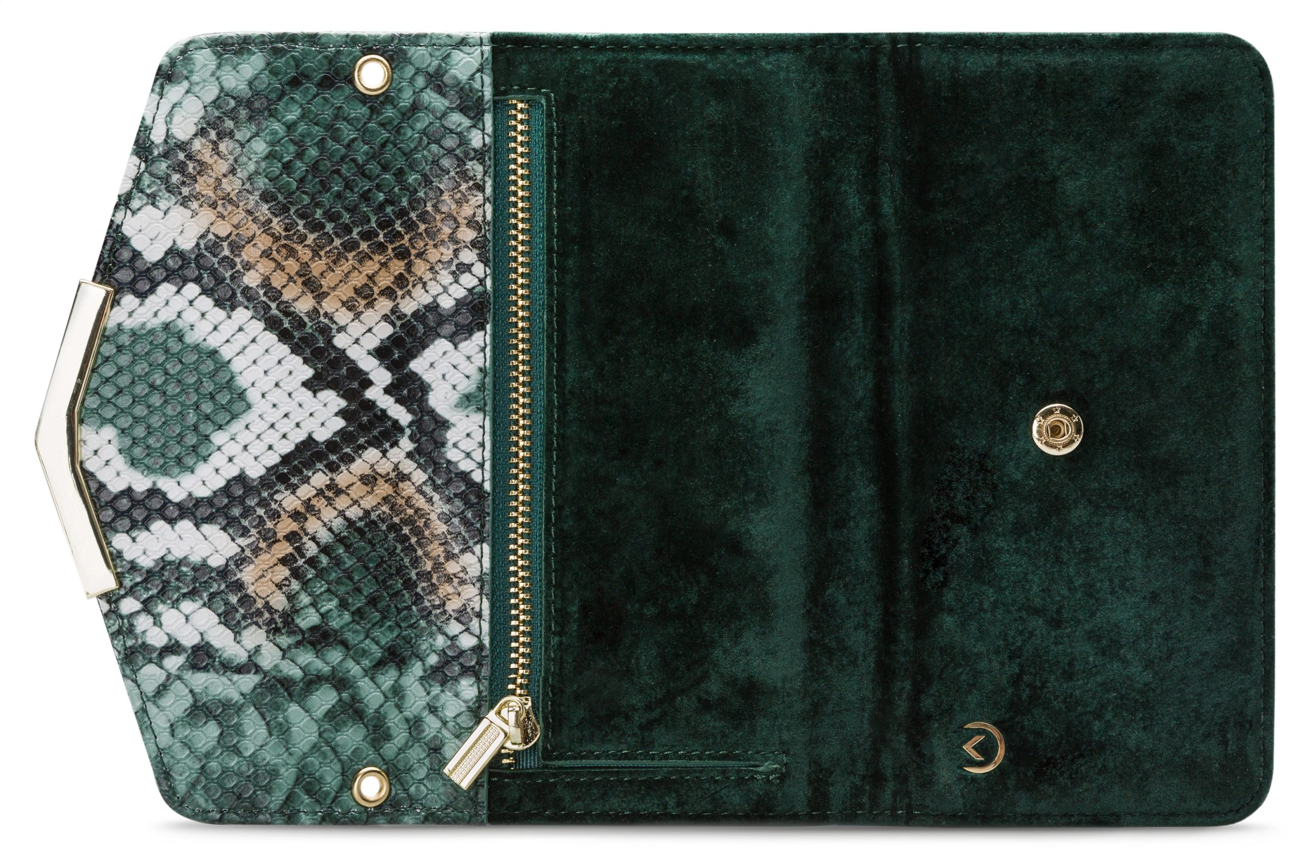 Het gebruik van de verschillende materialen en de hoge mate van afwerking maken de Clutch een unieke case. De buitenkant van de wallet is een combinatie van materiaal met een gedetailleerde slangenleren look en van materiaal met een zachte, luxe fluwele feel. Dit zet zich voort aan de binnenkant, de achterkant van de cover en de handige pols-strap, zodat alles goed bij elkaar past.