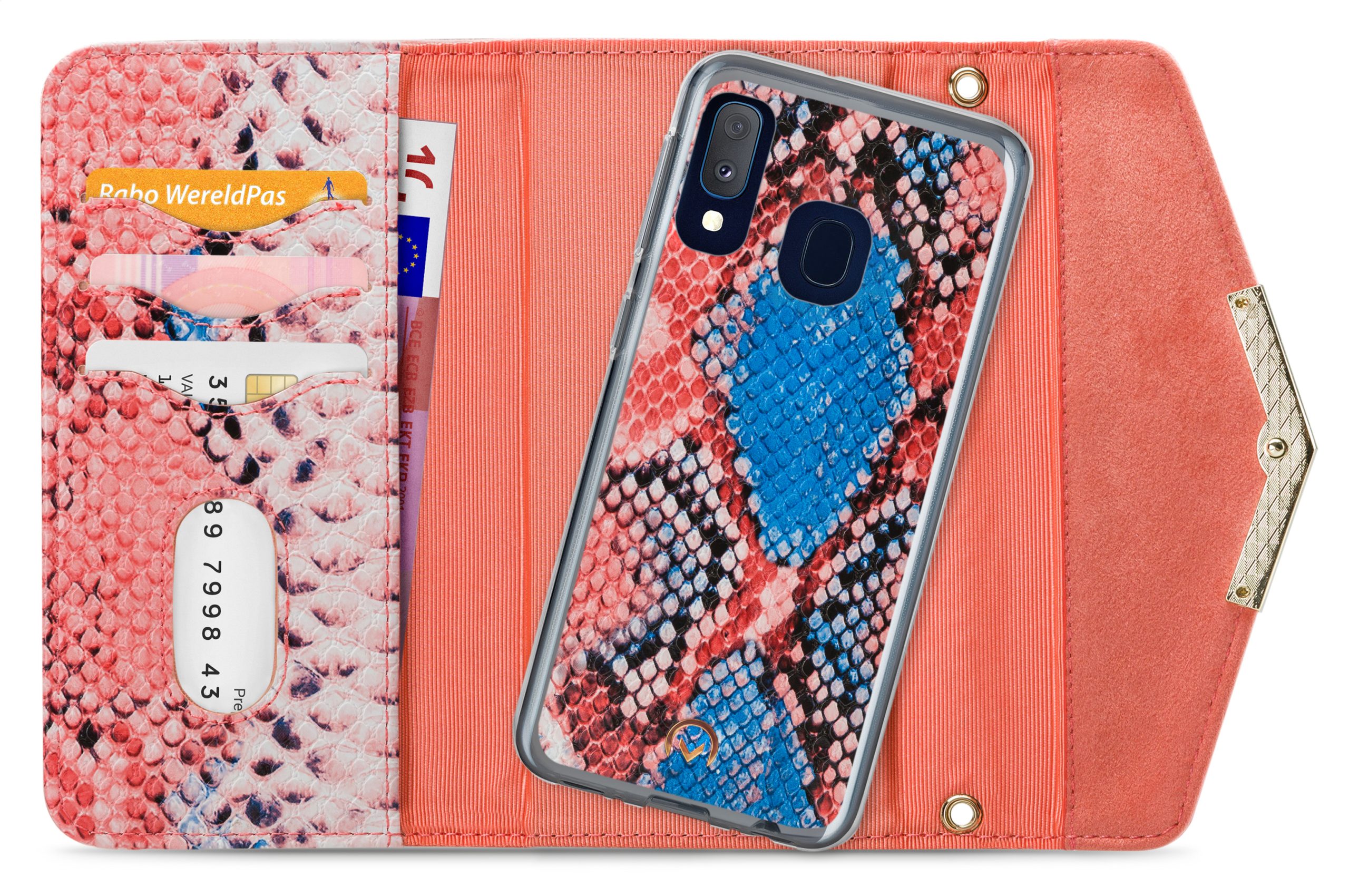 Het gebruik van de verschillende materialen en de hoge mate van afwerking maken de Clutch een unieke case. De buitenkant van de wallet is een combinatie van materiaal met een gedetailleerde slangenleren look en van materiaal met een zachte, luxe fluwele feel. Dit zet zich voort aan de binnenkant, de achterkant van de cover en de handige pols-strap, zodat alles goed bij elkaar past.