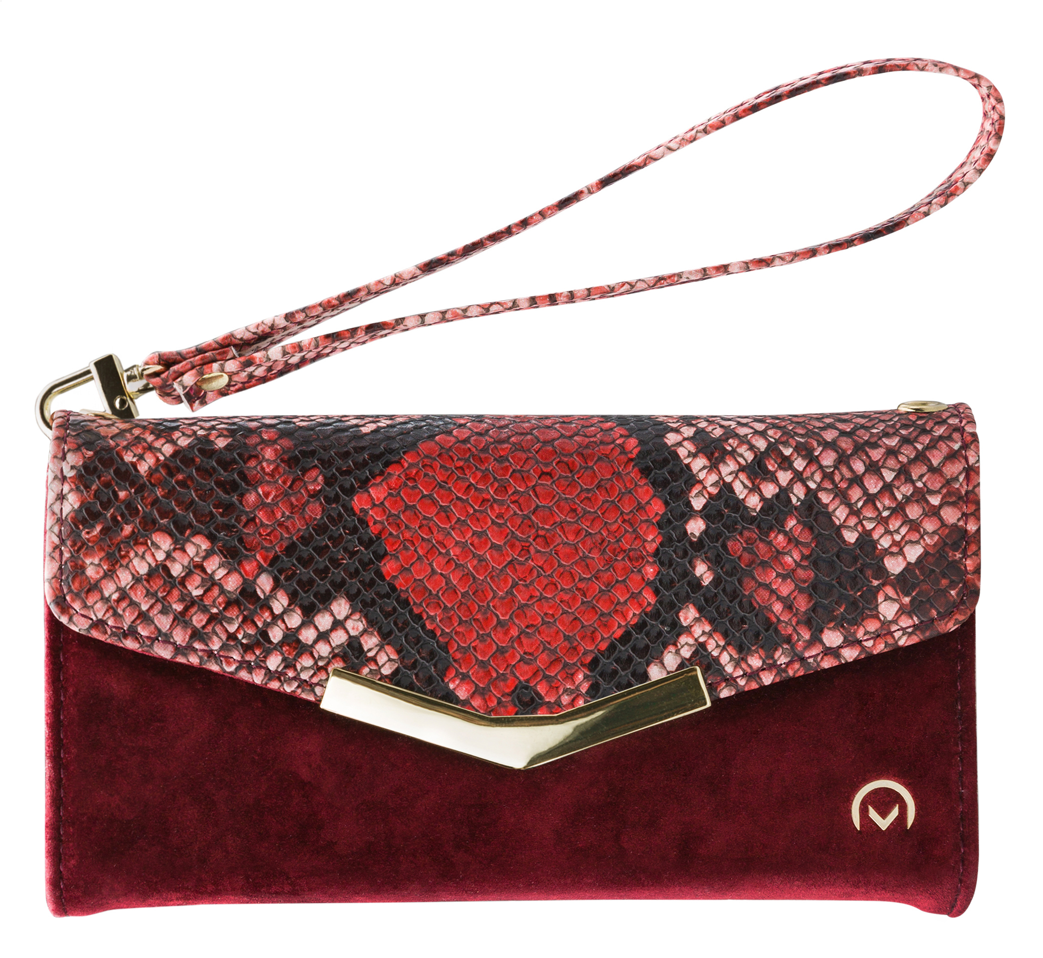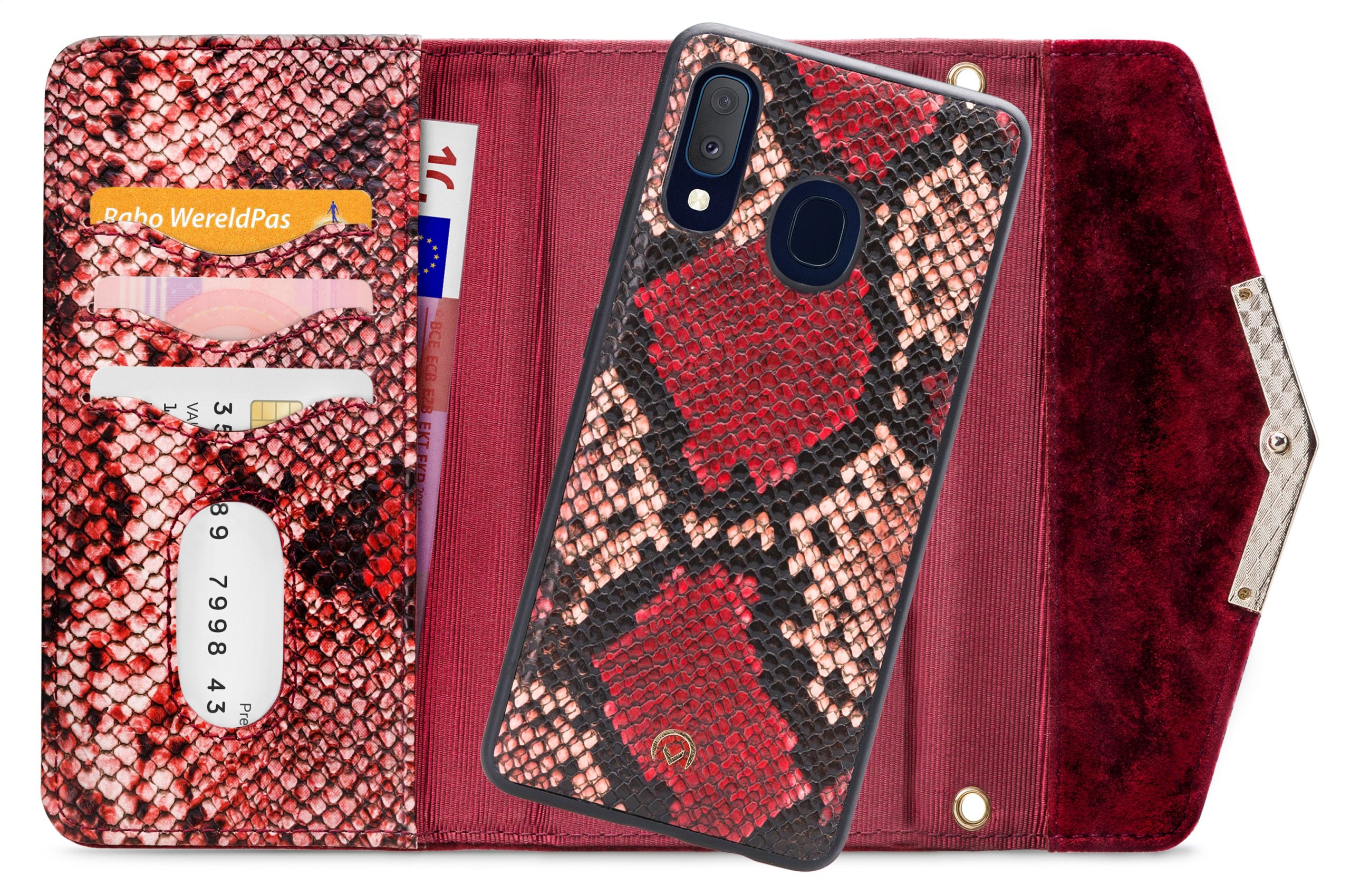 Het gebruik van de verschillende materialen en de hoge mate van afwerking maken de Clutch een unieke case. De buitenkant van de wallet is een combinatie van materiaal met een gedetailleerde slangenleren look en van materiaal met een zachte, luxe fluwele feel. Dit zet zich voort aan de binnenkant, de achterkant van de cover en de handige pols-strap, zodat alles goed bij elkaar past.