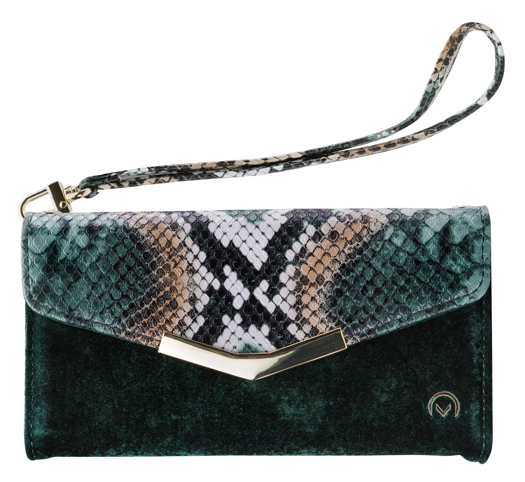 Het gebruik van de verschillende materialen en de hoge mate van afwerking maken de Clutch een unieke case. De buitenkant van de wallet is een combinatie van materiaal met een gedetailleerde slangenleren look en van materiaal met een zachte, luxe fluwele feel. Dit zet zich voort aan de binnenkant, de achterkant van de cover en de handige pols-strap, zodat alles goed bij elkaar past.