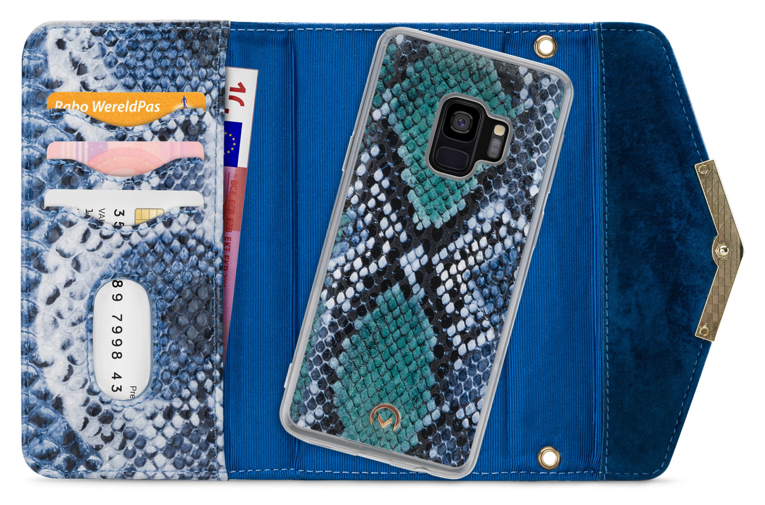 Het gebruik van de verschillende materialen en de hoge mate van afwerking maken de Clutch een unieke case. De buitenkant van de wallet is een combinatie van materiaal met een gedetailleerde slangenleren look en van materiaal met een zachte, luxe fluwele feel. Dit zet zich voort aan de binnenkant, de achterkant van de cover en de handige pols-strap, zodat alles goed bij elkaar past.