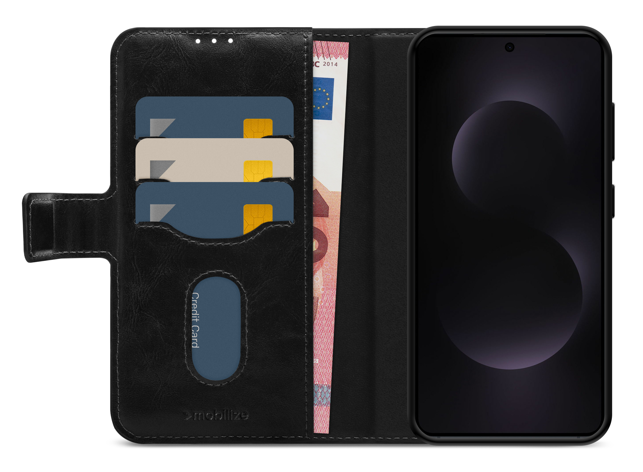 Aan de binnenkant van de book case vind je twee vakjes voor bankpassen of briefgeld, waarvan één met een handige slide-uitsparing. Daarnaast is er een groot vak voor papieren, waardoor je al je essentiële items overzichtelijk en bij de hand hebt. De case en cover zijn zo ontworpen dat alle uitsparingen voor camera, geluid en connectoren perfect toegankelijk blijven. Zo blijft jouw mobiel volledig functioneel, ook in de case.