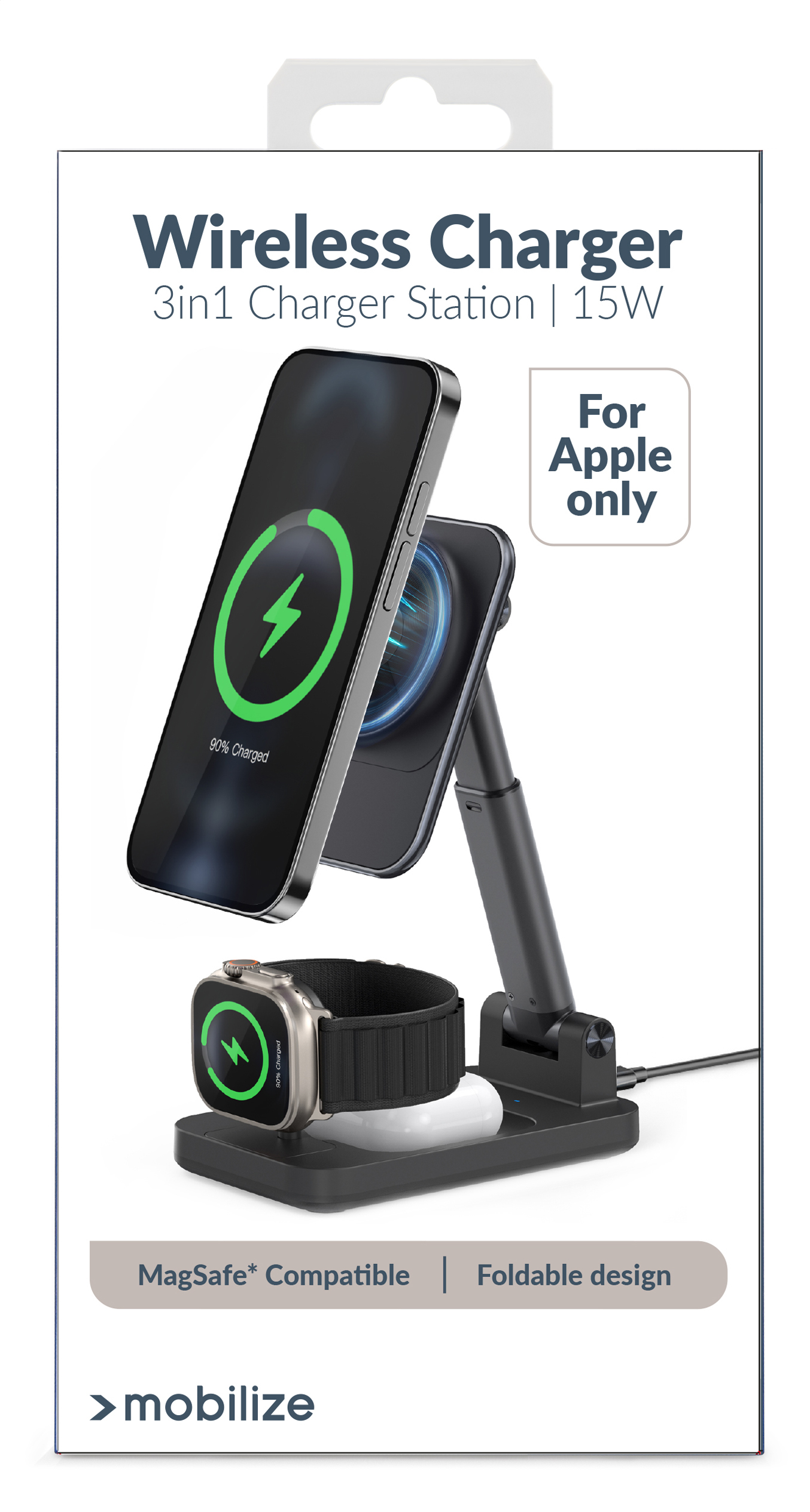 Het Mobilize 3in1 Charger Station biedt een revolutionaire laadervaring voor je Apple ecosystem, waardoor het een essentieel accessoire is voor iedere Apple liefhebber. Dit laadstation, compatibel met MagSafe, is speciaal ontworpen om je iPhone, Apple Watch en AirPods gelijktijdig en efficiënt op te laden. Met een stijlvol design en een krachtige output van 15W, is dit laadstation de perfecte aanvulling voor je nachtkastje of bureau. Het is ook 1 van de eerste MagSafe chargers die jouw iPhone met 15W laadt, mits je iPhone dit ondersteunt.