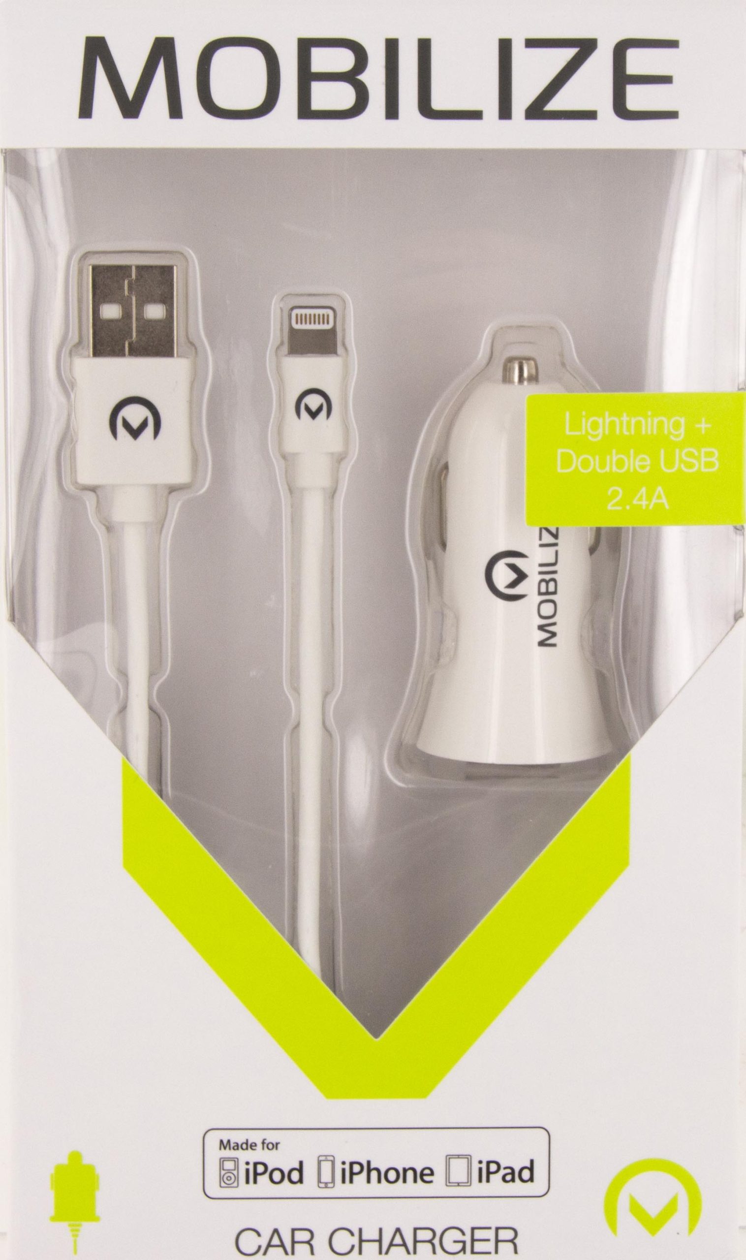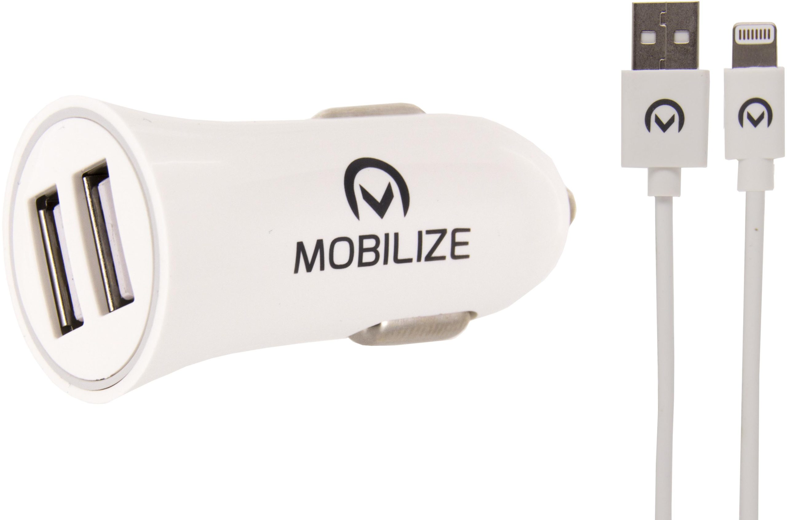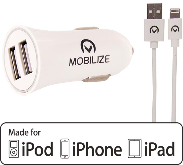 De Mobilize Car Charger Dual USB is een duurzame lader en beschikt over twee USB aansluitingen. Hierdoor heeft u de mogelijkheid om meerdere apparaten tegelijk op te laden. Bij de Dual Car Charger wordt een Lightning kabel meegeleverd van ca. 1 meter. Daarnaast kunt u uw eigen USB kabel gebruiken om bijvoorbeeld een tablet, navigatiesysteem of andere smartphone op te laden. Door simpelweg in beide USB poorten een kabel te pluggen en deze vervolgens op de gewenste apparaten aan te sluiten start hij vanzelf met laden. De 2 poorten samen hebben een maximale output van 2.4A. Tijdens het laden zal een ring oplichten, om aan te geven dat de lader in gebruik is.