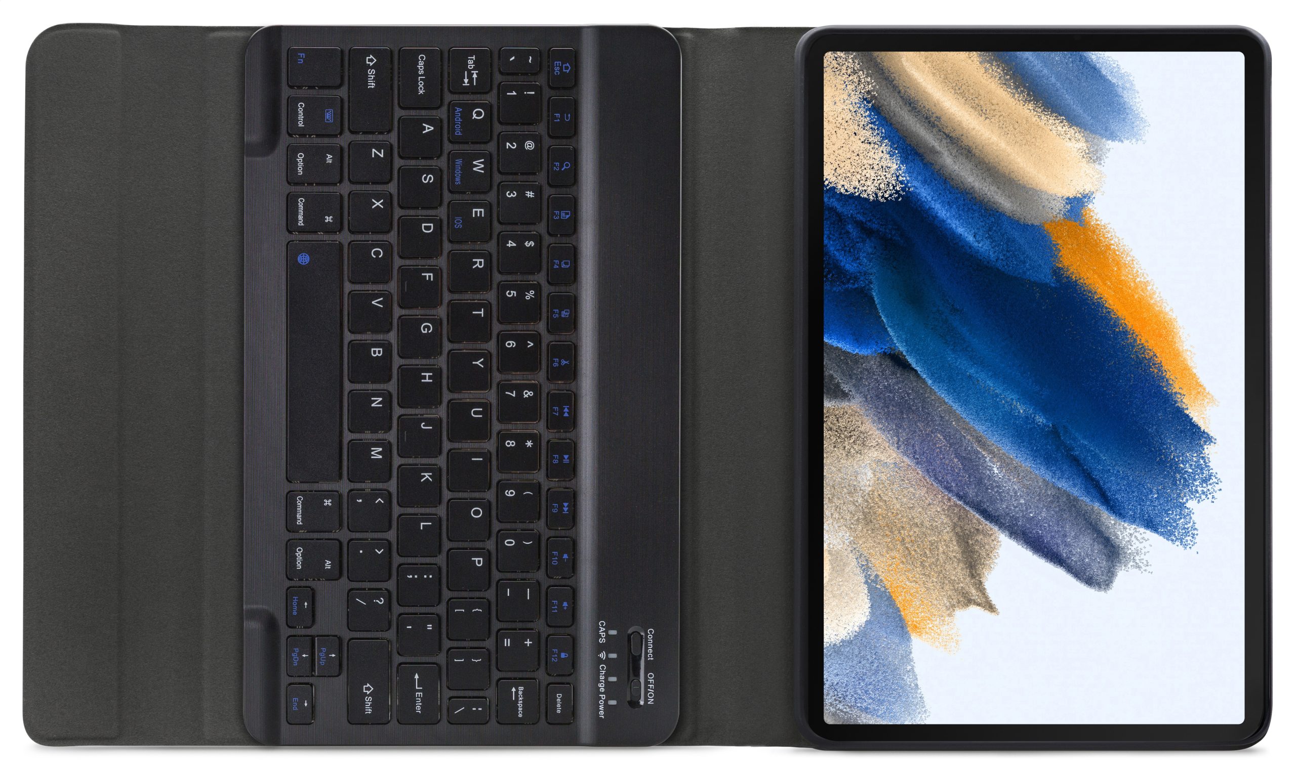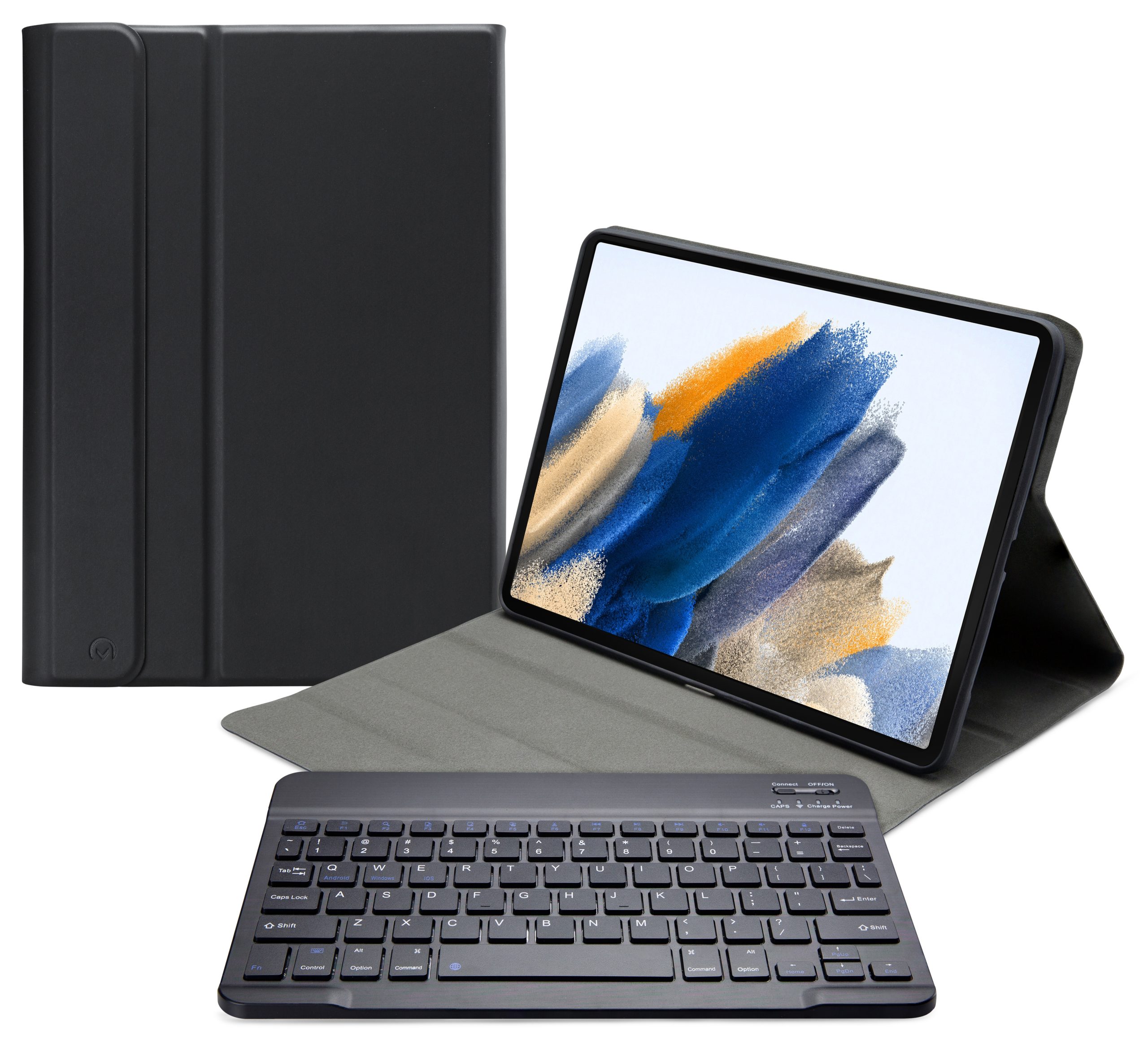 Dankzij gleuven aan de binnenkant van de case is de tablet is in 3 verschillende standen te zetten voor beter zicht op het scherm tijdens het typen van je document of Teams-vergadering. Door middel van Bluetooth maakt u verbinding met het QWERTY-toetsenbord. Het uitneembare toetsenbord is licht van gewicht, heeft een solide bouw zodat het comfortabel typt en zit met sterke magneten stevig vast in de case. Een extra laag microfiber onder het toetsenbord zorgt er ook nog eens voor dat het niet weg zal glijden tijdens gebruik en voor extra stevigheid. In de flap van de case zit ook een sterke magneet die de gehele case netjes afsluit.