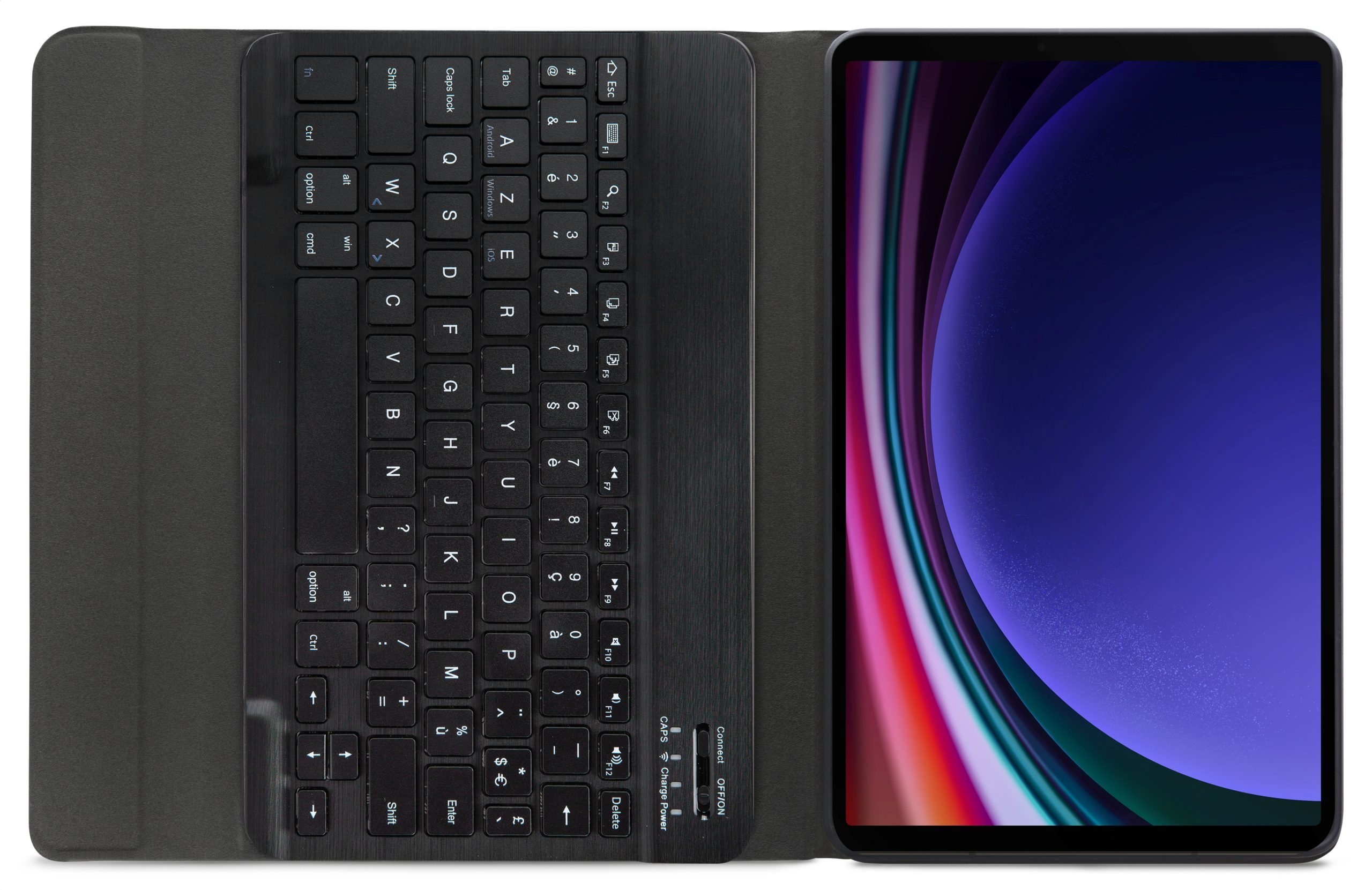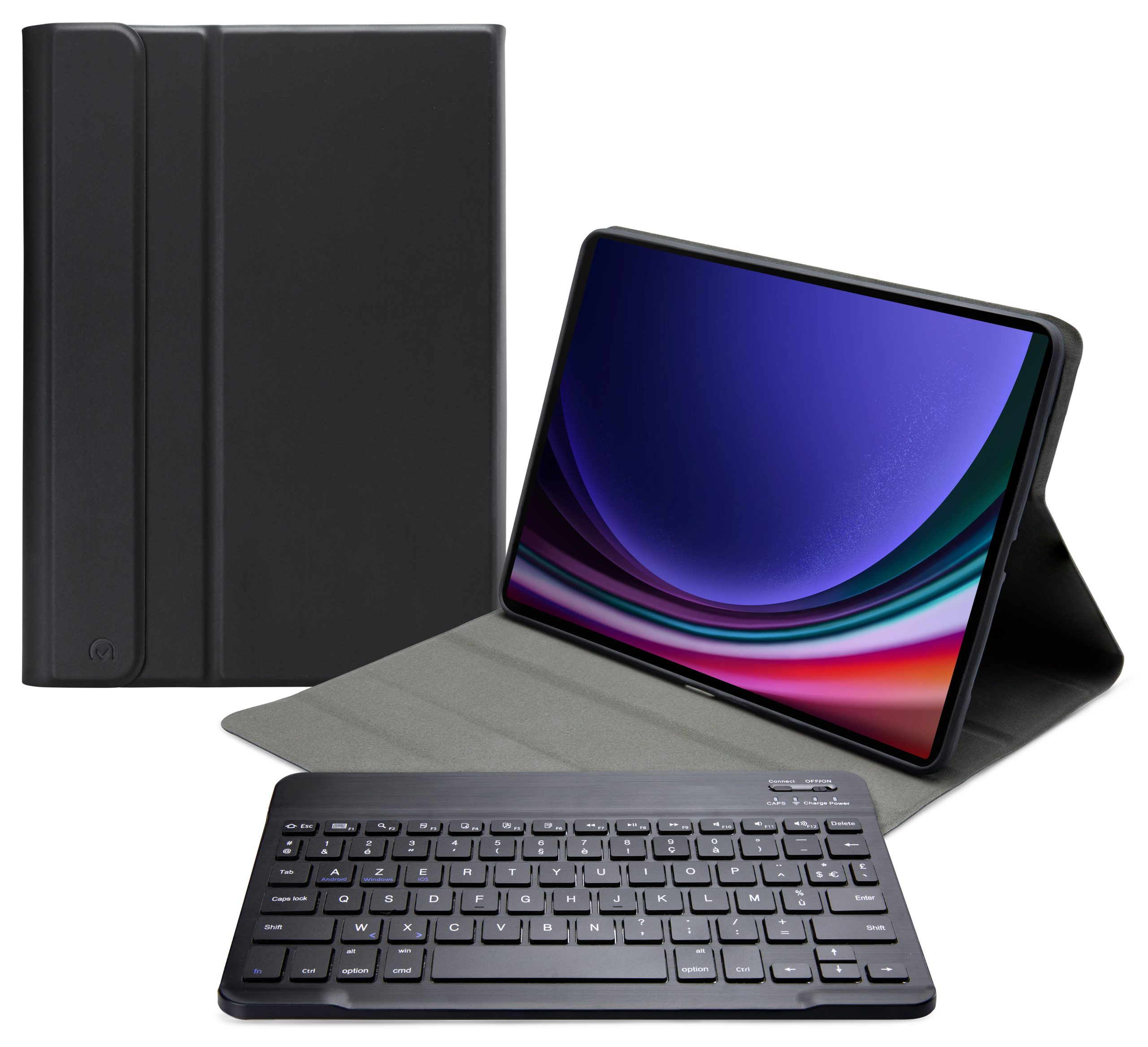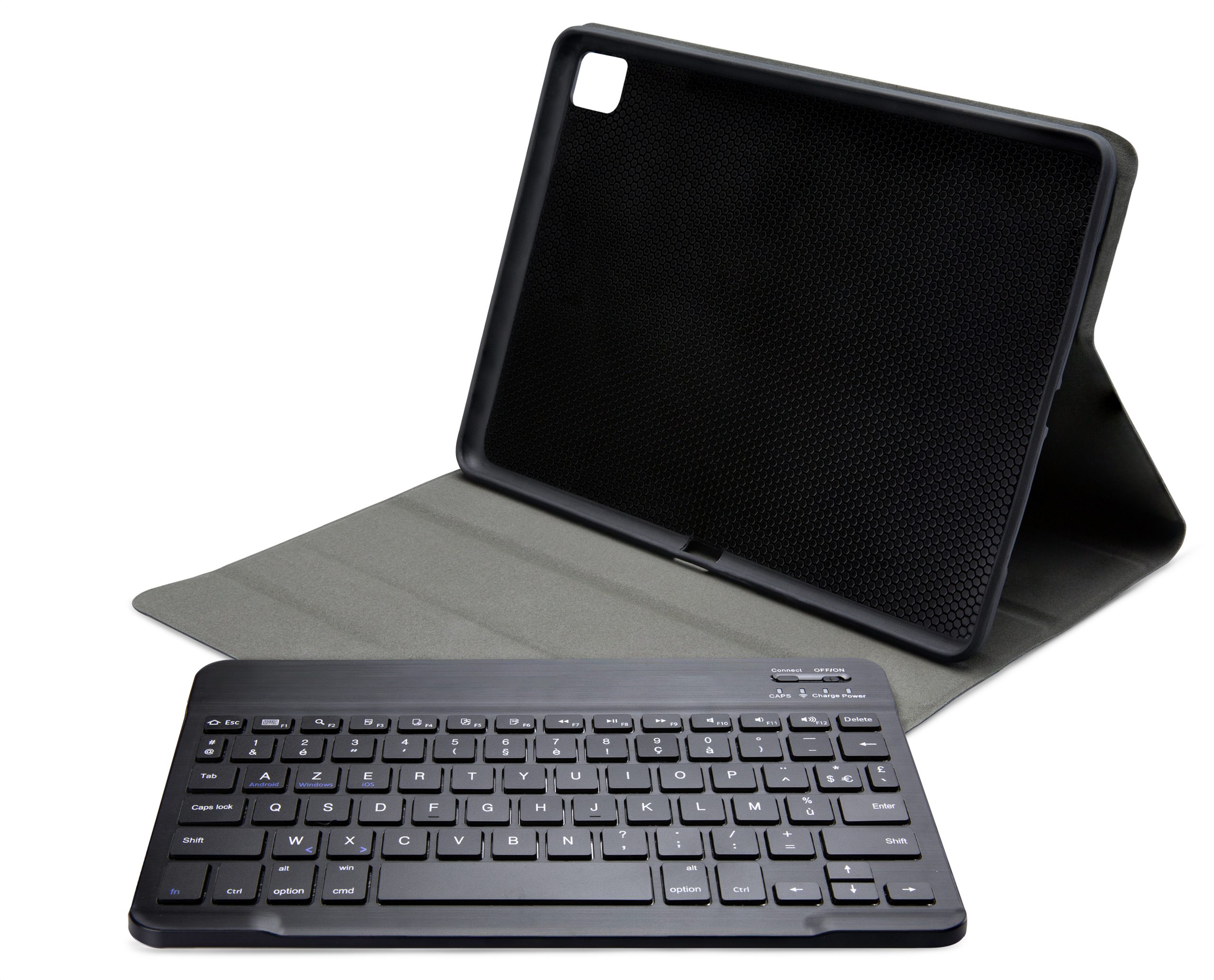 Dankzij gleuven aan de binnenkant van de case is de tablet is in 3 verschillende standen te zetten voor beter zicht op het scherm tijdens het typen van je document of Teams-vergadering. Door middel van Bluetooth maakt u verbinding met het AZERTY-toetsenbord. Het uitneembare toetsenbord is licht van gewicht, heeft een solide bouw zodat het comfortabel typt en zit met sterke magneten stevig vast in de case. Een extra laag microfiber onder het toetsenbord zorgt er ook nog eens voor dat het niet weg zal glijden tijdens gebruik en voor extra stevigheid. In de flap van de case zit ook een sterke magneet die de gehele case netjes afsluit.