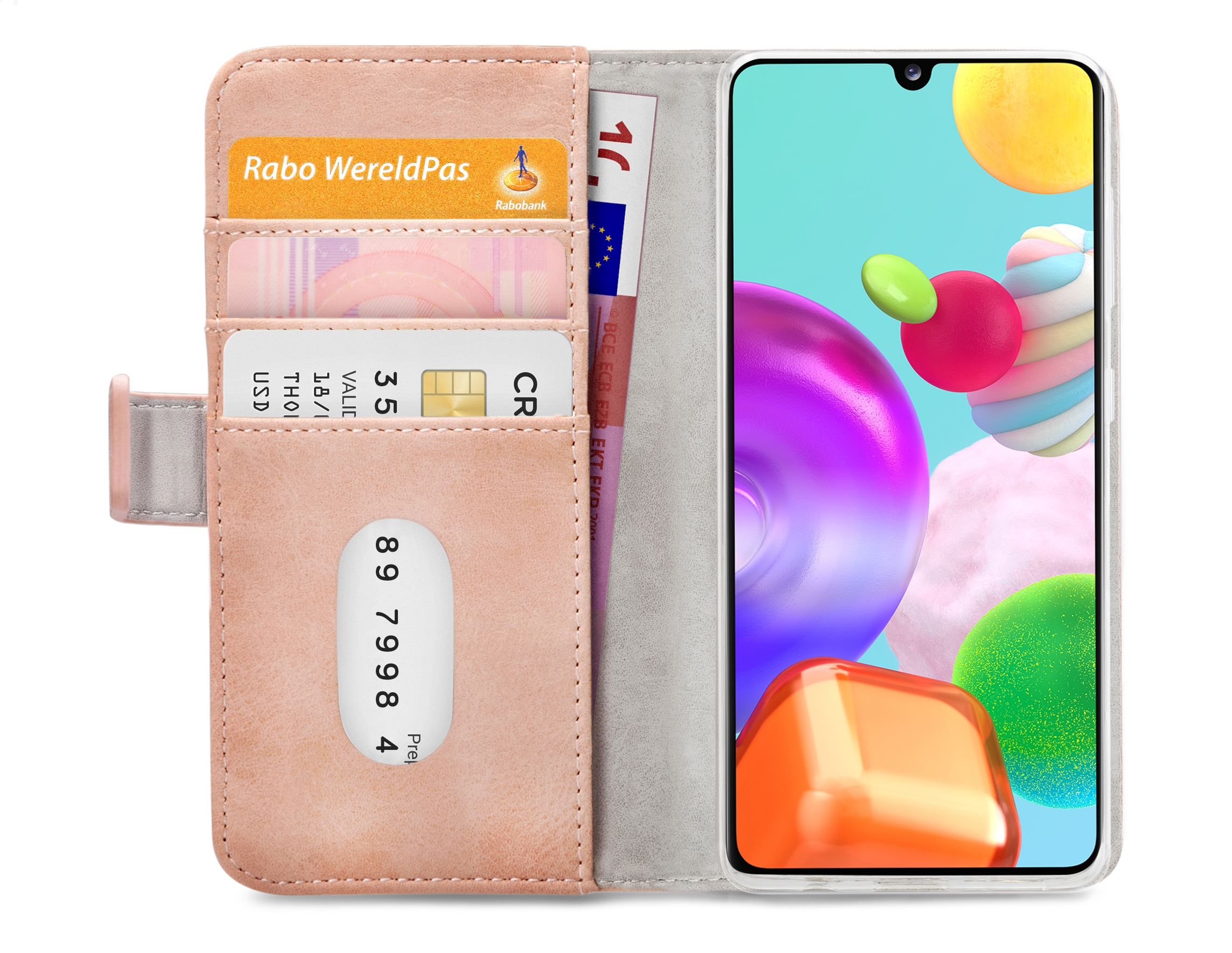 De vele uitsparingen in de Gelly cover zorgen er voor dat u alle knoppen en aansluitingen goed kunt blijven gebruiken. Het voordeel van een Gelly cover is dat deze door zijn flexibiliteit langer meegaat en niet breekt. De case in zijn geheel is mooi compact en u hem daarom gemakkelijk overal mee naar toe nemen. Aan de linker binnenkant van de case zitten drie horizontale vakken voor pasjes, visitekaartjes of briefgeld. De kleur evenals het materiaal voor de horizontale vakken zijn gelijk aan de kleur en het materiaal aan de buitenkant.