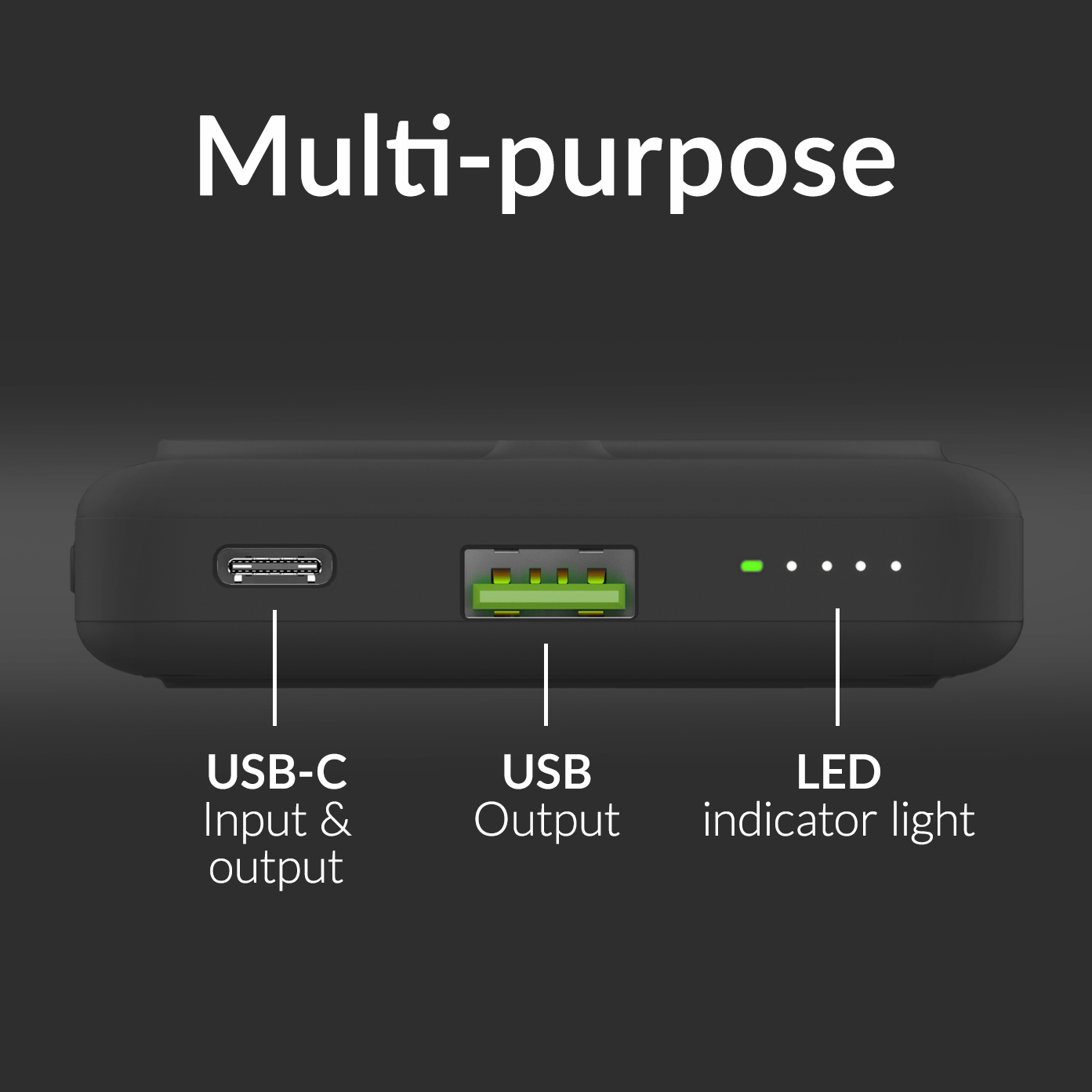 Het heeft een USB-A output voor traditioneel opladen, en een USB-C poort die zowel als input als output kan dienen, wat de Mobilize Magnetic Wireless Power Bank zeer veelzijdig maakt.