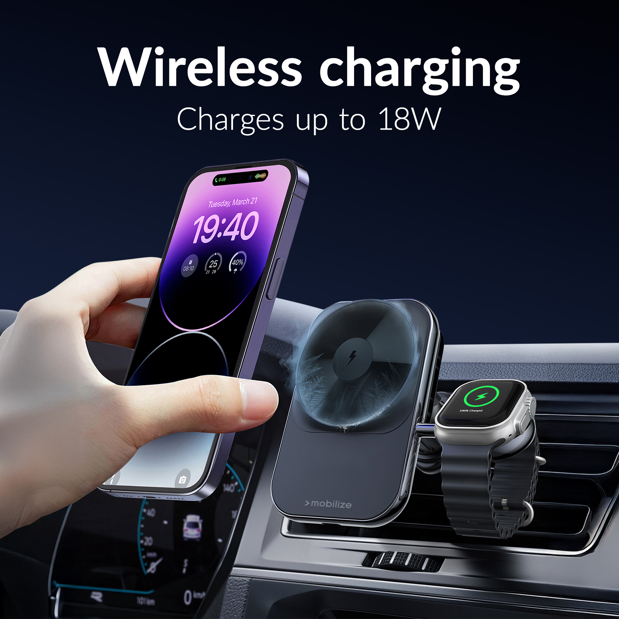 De Mobilize MagSafe Compatible Car Charger is dé slimme oplaadoplossing voor onderweg. Speciaal ontworpen voor MagSafe-compatibele iPhones, cases én Apple Watches, biedt deze krachtige draadloze autolader ultiem gebruiksgemak. Het unieke 2-in-1 ontwerp met afneembare Apple Watch-oplader maakt hem bijzonder flexibel – of je nu onderweg bent of even je Watch bij wilt laden aan je laptop.