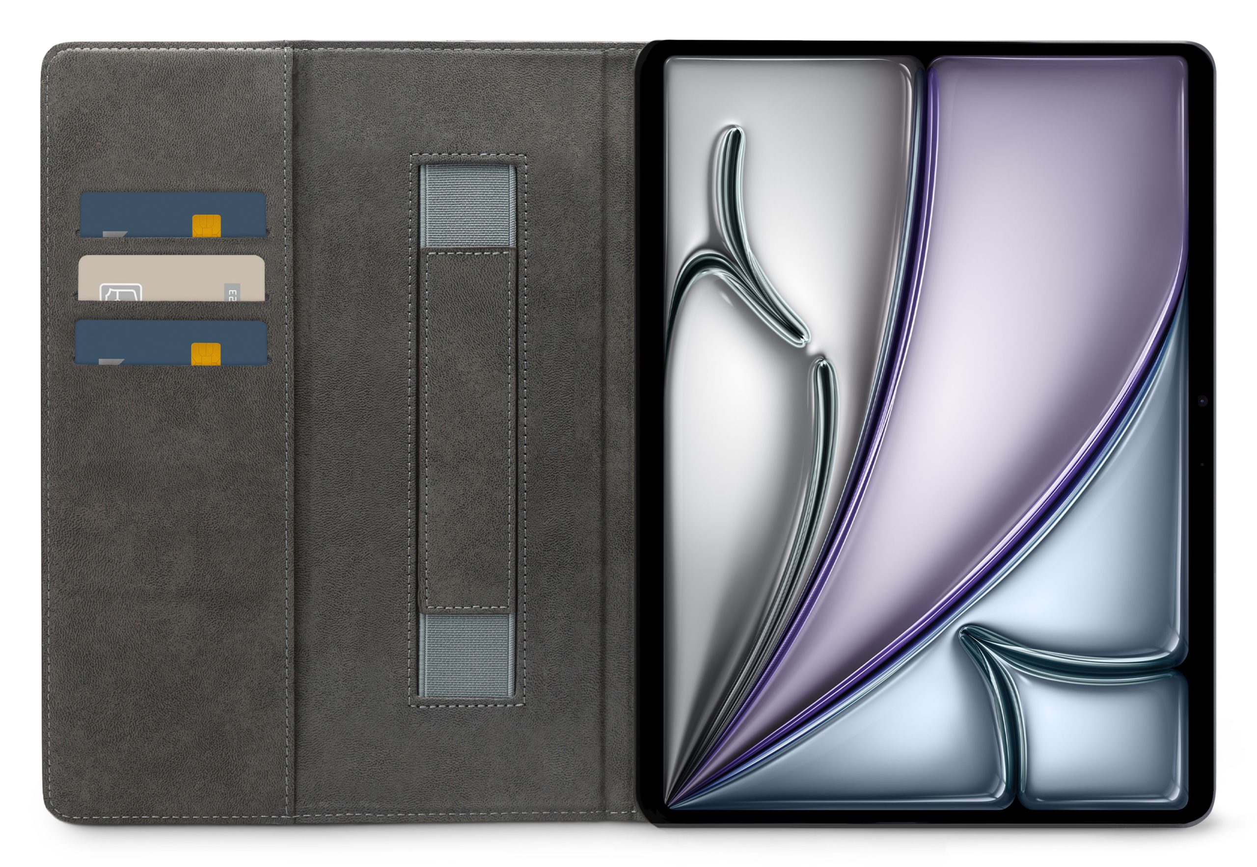 Aan de linker binnenkant van de case vind je drie vakjes waar je pasjes, briefgeld en visitekaartjes kunt opbergen. De case is voorzien van een handige stand functie, waardoor je je tablet gemakkelijk kunt neerzetten om bijvoorbeeld video's te kijken of foto's te bekijken. Bovendien heeft de case aan de linker binnenkant een handige band waar je je hand doorheen kunt steken om je tablet stevig vast te houden.