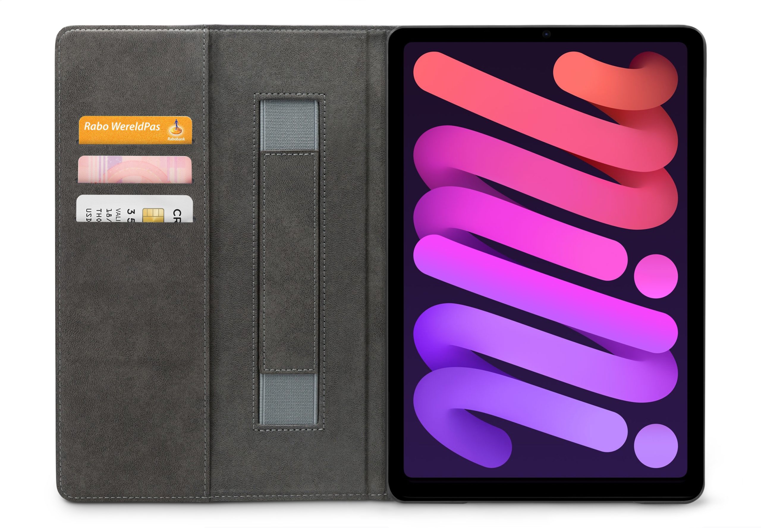 Aan de linker binnenkant van de case vind je drie vakjes waar je pasjes, briefgeld en visitekaartjes kunt opbergen. De case is voorzien van een handige stand functie, waardoor je je tablet gemakkelijk kunt neerzetten om bijvoorbeeld video's te kijken of foto's te bekijken. Bovendien heeft de case aan de linker binnenkant een handige band waar je je hand doorheen kunt steken om je tablet stevig vast te houden.
