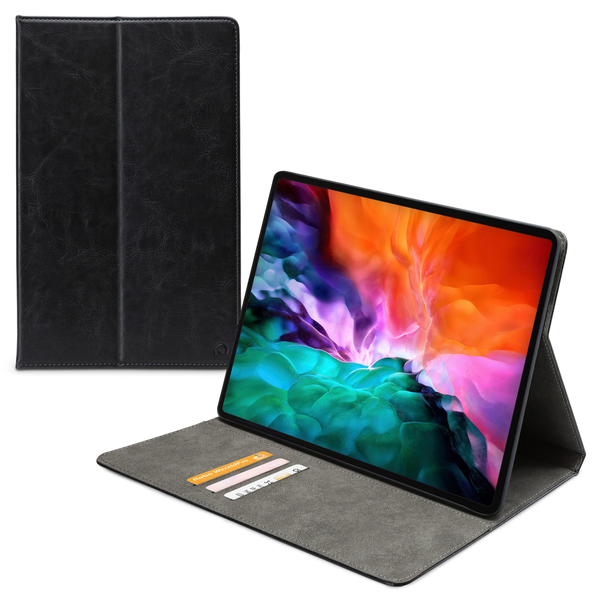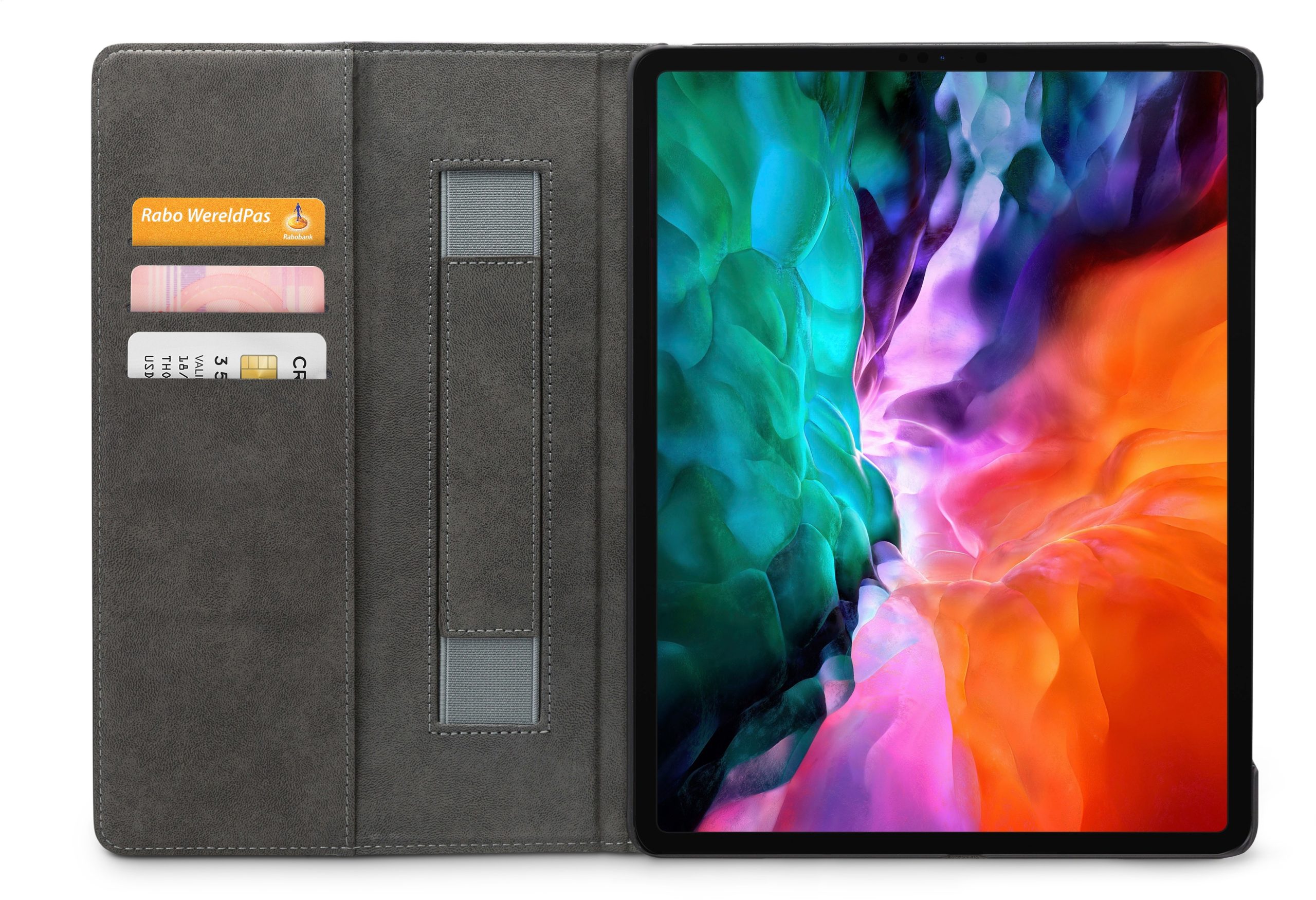 Aan de linker binnenkant van de case vind je drie vakjes waar je pasjes, briefgeld en visitekaartjes kunt opbergen. De case is voorzien van een handige stand functie, waardoor je je tablet gemakkelijk kunt neerzetten om bijvoorbeeld video's te kijken of foto's te bekijken. Bovendien heeft de case aan de linker binnenkant een handige band waar je je hand doorheen kunt steken om je tablet stevig vast te houden.