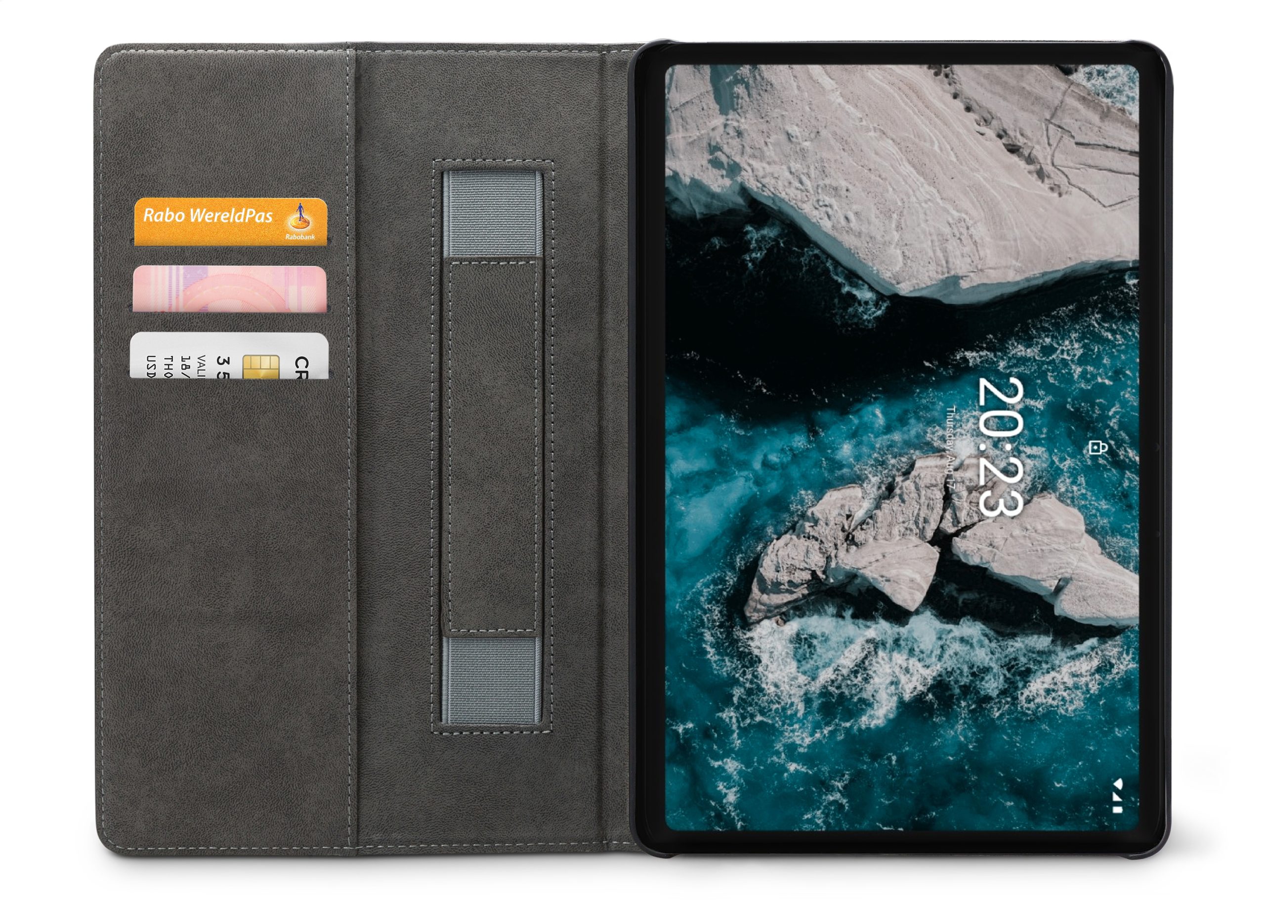 Aan de linker binnenkant van de case vind je drie vakjes waar je pasjes, briefgeld en visitekaartjes kunt opbergen. De case is voorzien van een handige stand functie, waardoor je je tablet gemakkelijk kunt neerzetten om bijvoorbeeld video's te kijken of foto's te bekijken. Bovendien heeft de case aan de linker binnenkant een handige band waar je je hand doorheen kunt steken om je tablet stevig vast te houden.