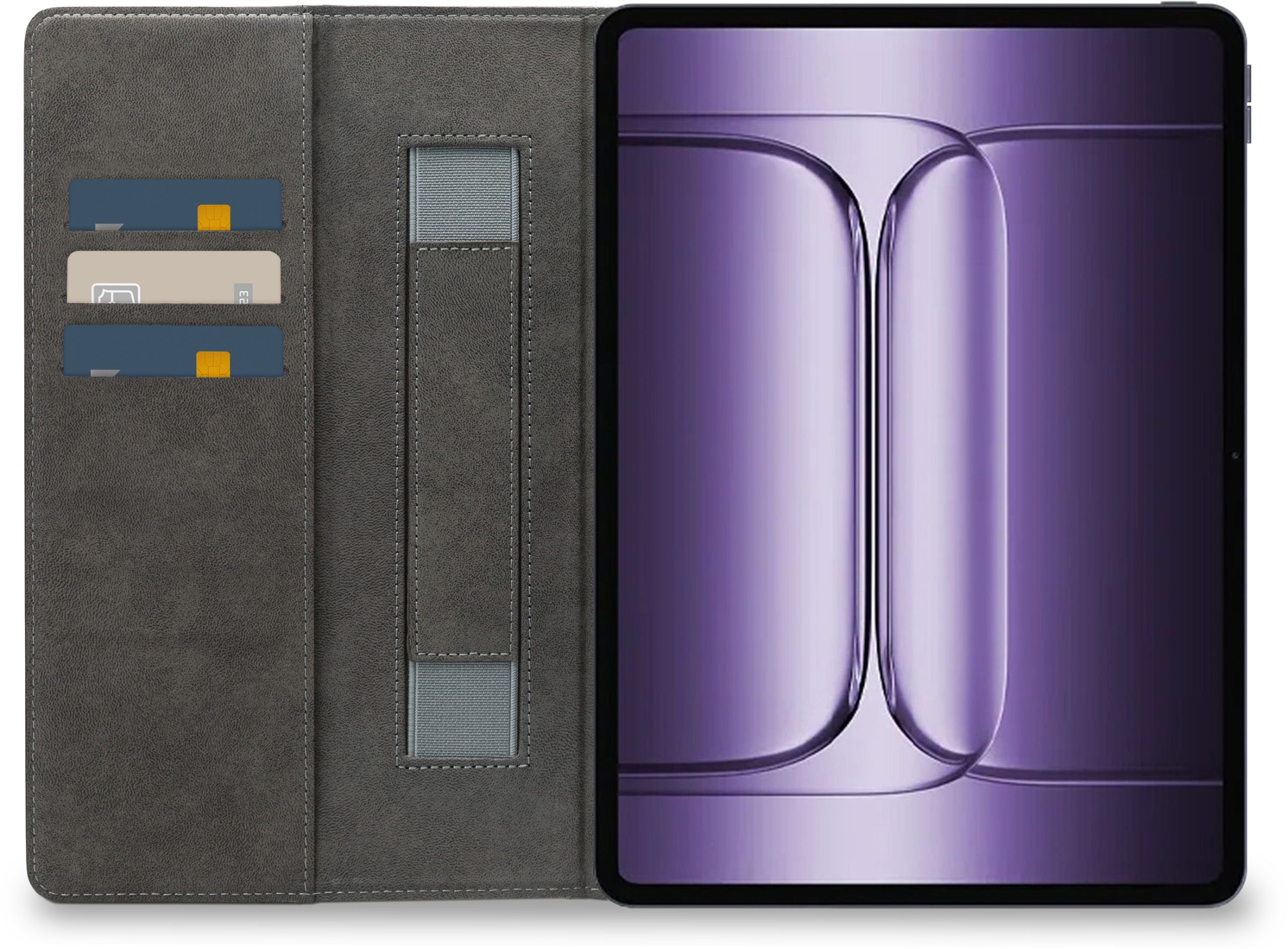 Aan de linker binnenkant van de case vind je drie vakjes waar je pasjes, briefgeld en visitekaartjes kunt opbergen. De case is voorzien van een handige stand functie, waardoor je je tablet gemakkelijk kunt neerzetten om bijvoorbeeld video's te kijken of foto's te bekijken. Bovendien heeft de case aan de linker binnenkant een handige band waar je je hand doorheen kunt steken om je tablet stevig vast te houden.