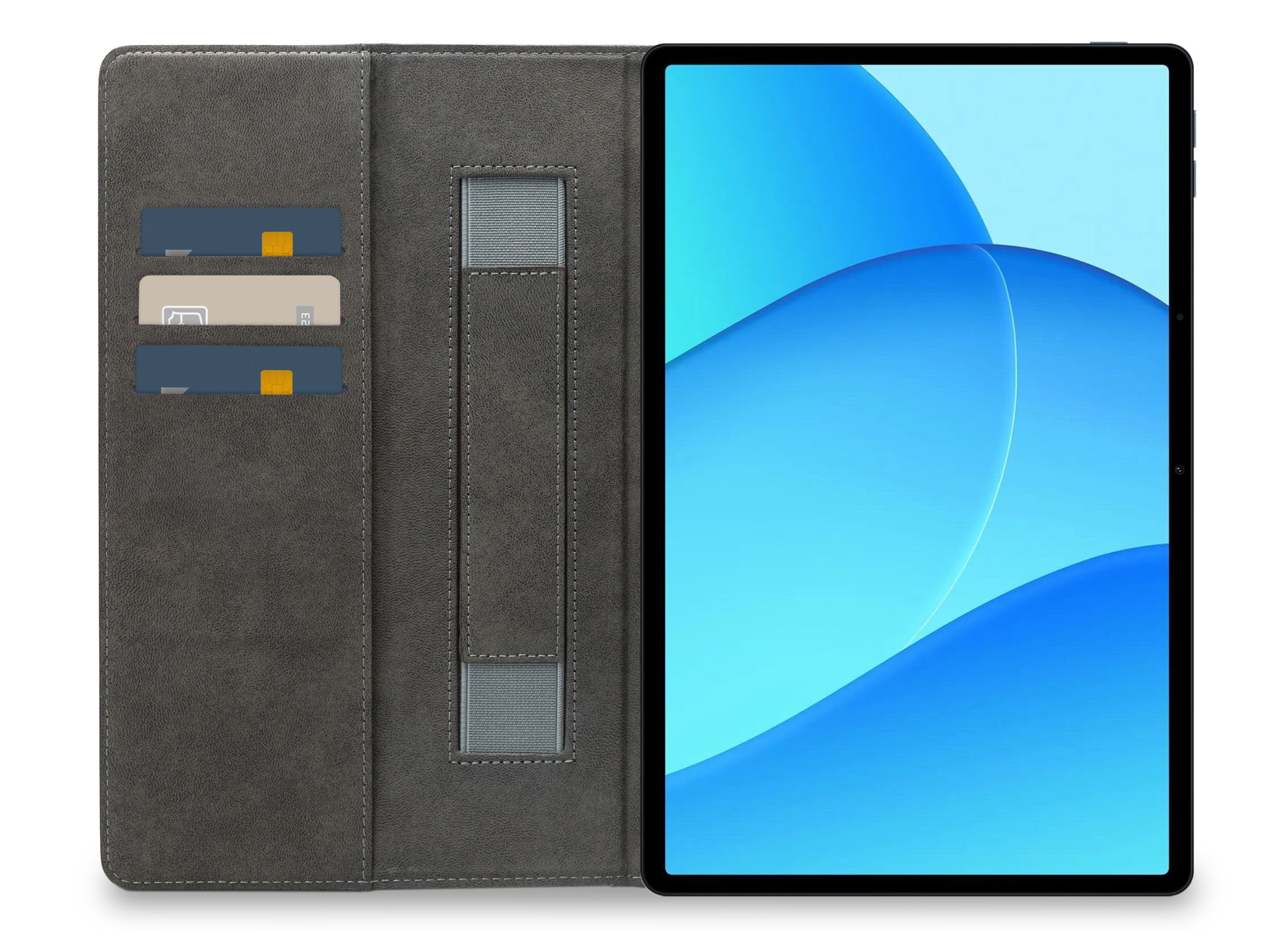 Aan de linker binnenkant van de case zitten drie vakjes voor pasjes, briefgeld en/of visitekaartjes. De case beschikt over een stand functie, zodat je hem makkelijk neer kunt zetten om bijvoorbeeld Netflix of foto’s te kijken. Ook heeft hij aan de linker binnenkant een band waar je hand doorheen kan steken zodat je jouw tablet goed vast kan houden.