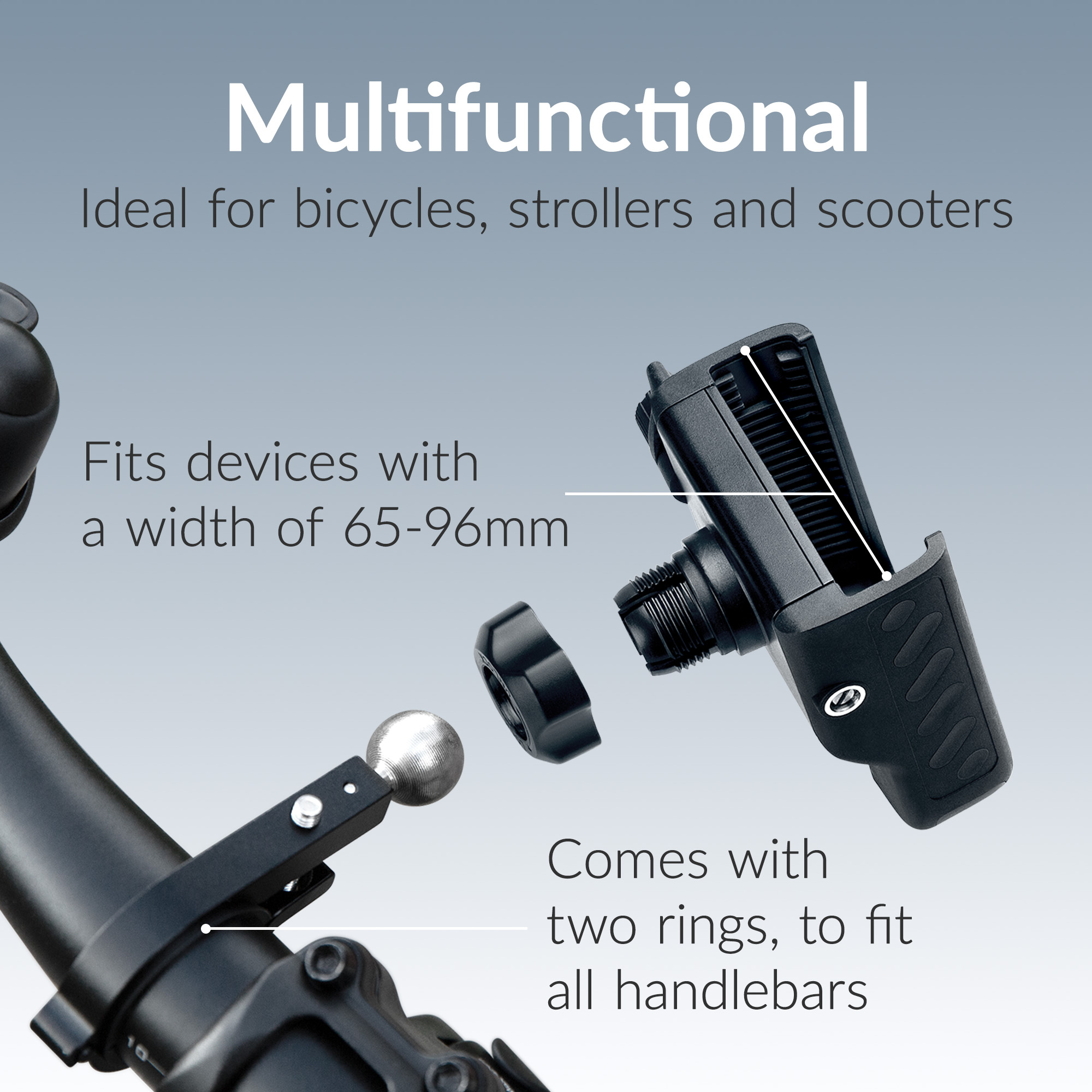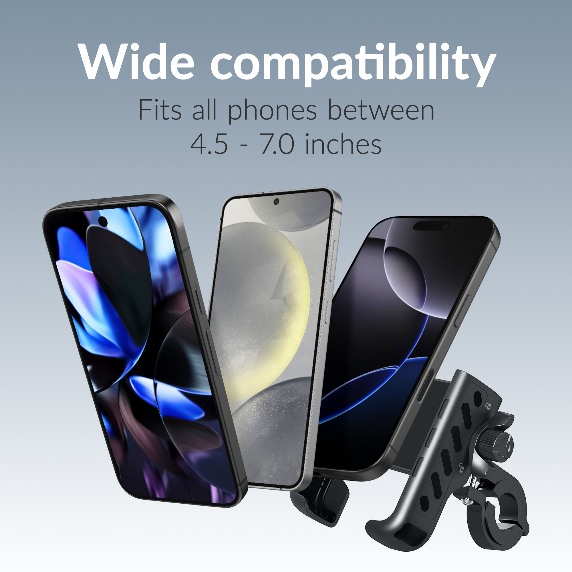 Gemaakt van sterke materialen zoals nylon met glasvezel (PA + GF), polycarbonaat (PC), rubber, siliconen en roestvrij staal, is de houder gebouwd om lang mee te gaan. Hij is compatibel met stuurdiameters van 20 tot 35 mm, wat hem geschikt maakt voor de meeste fietsen. Je kunt de houder eenvoudig en veilig vastzetten aan het fietsstuur met behulp van de meegeleverde inbussleutel, zodat hij stevig blijft zitten, zelfs op hobbelige wegen.