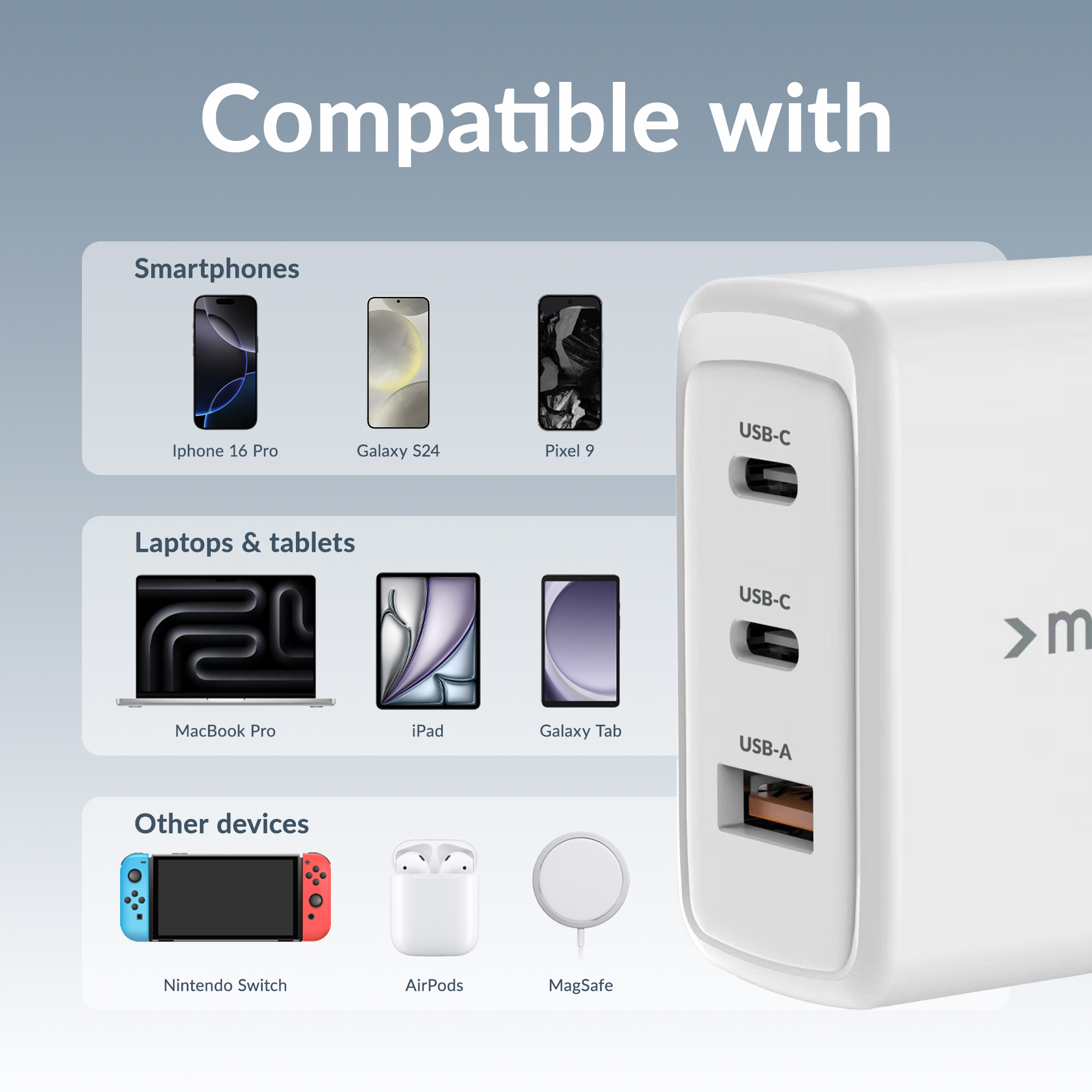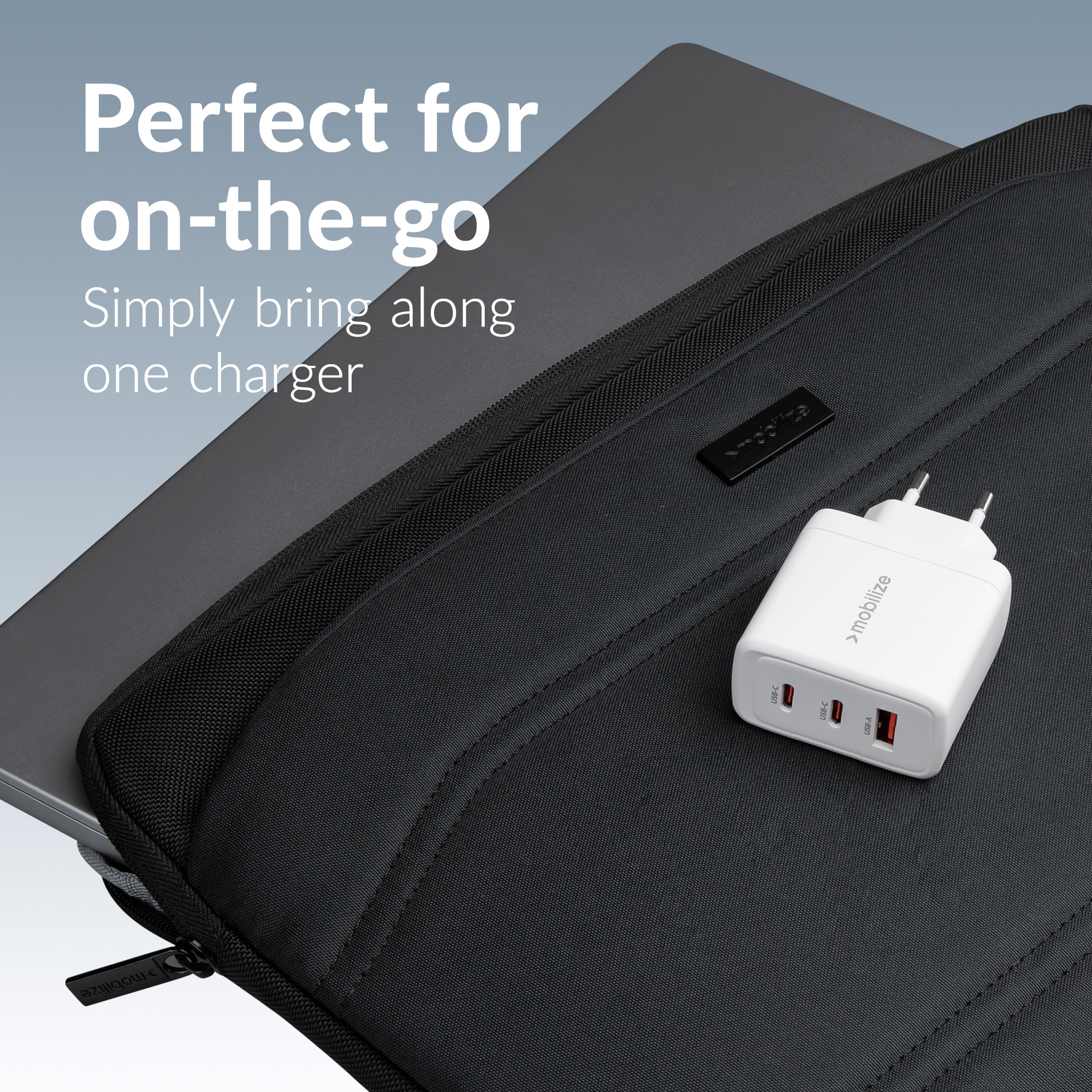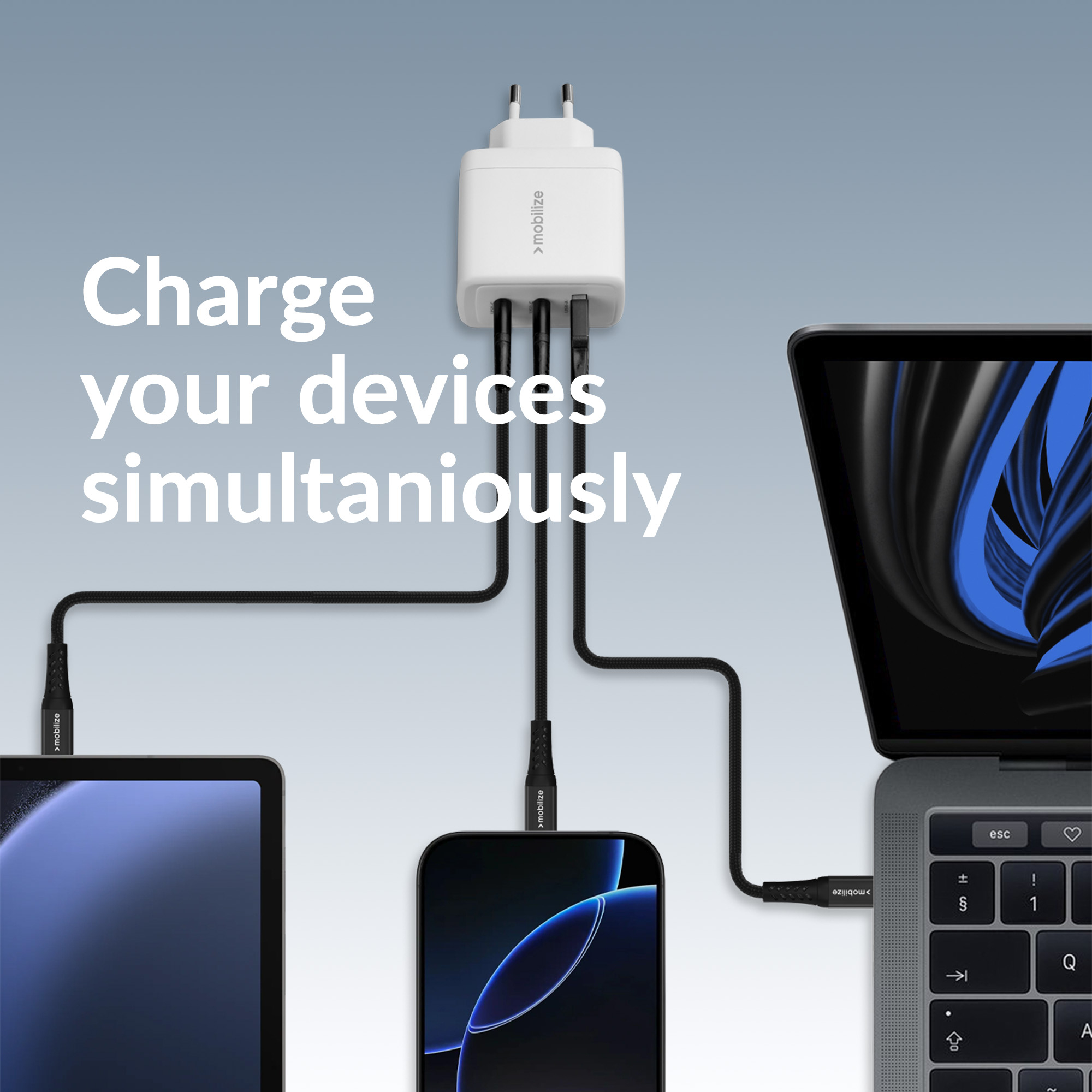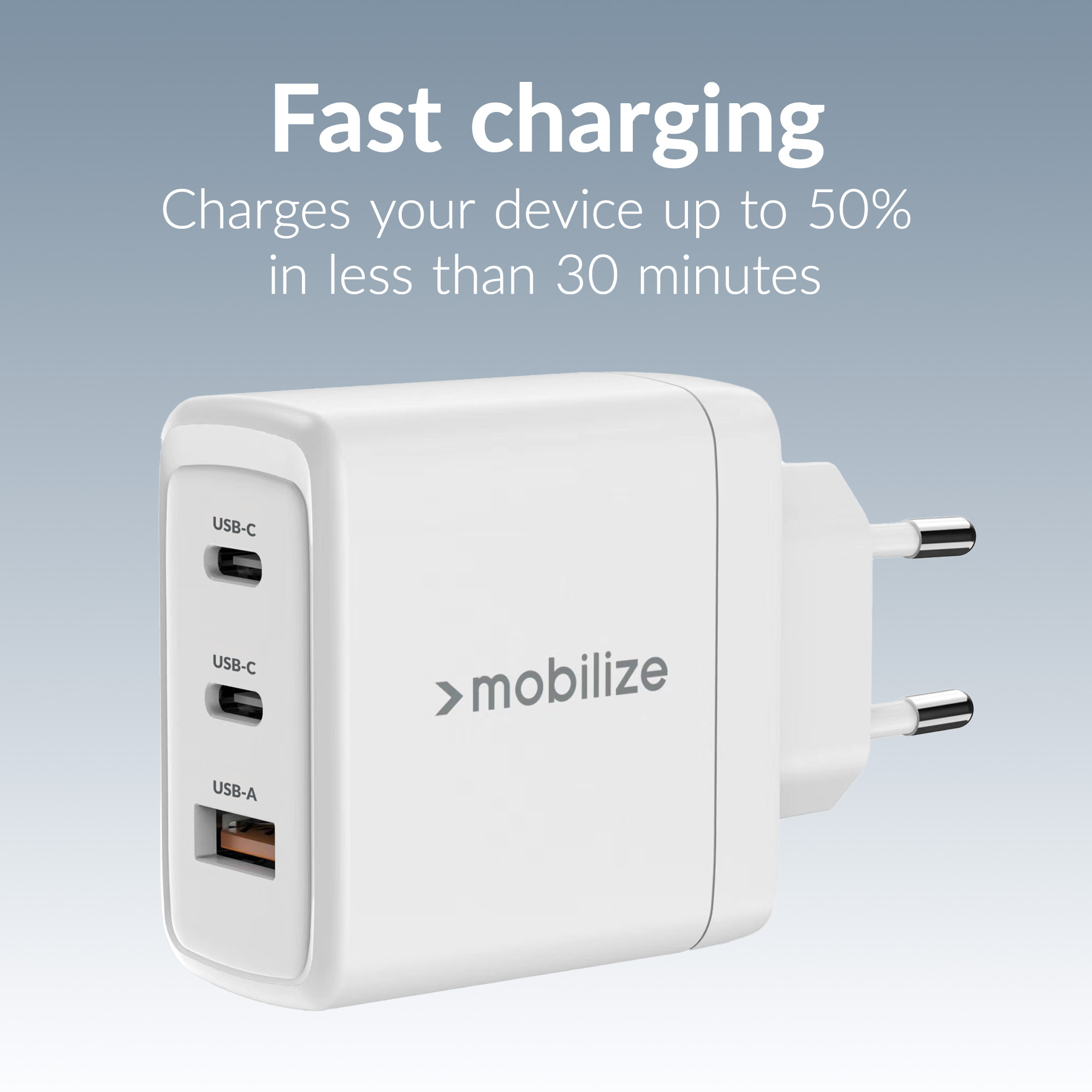 Met twee USB-C-poorten en één USB-A-poort biedt de Mobilize Wall Charger ultieme flexibiliteit. De USB-C-poorten ondersteunen Power Delivery (PD) en Programmeerbare Voeding (PPS), wat zorgt voor snelle en efficiënte oplading.