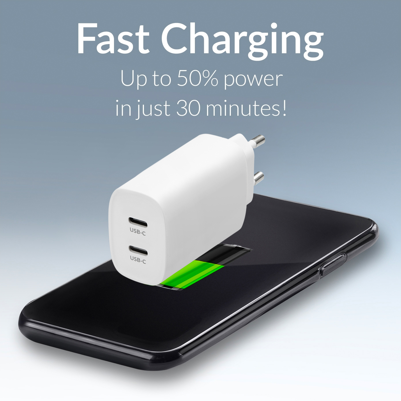 Ontmoet de Mobilize Wall Charger, jouw nieuwe, USB-C lader voor het stopcontact. Met twee USB-C poorten en een totaal vermogen van 45W, is deze lader een krachtig accessoire voor al je apparaten. Deze slimme en veilige lader maakt gebruik van PD/PPS technologie, waarmee je jouw apparaat in minder dan 30 minuten van 0% naar 50% kunt opladen.