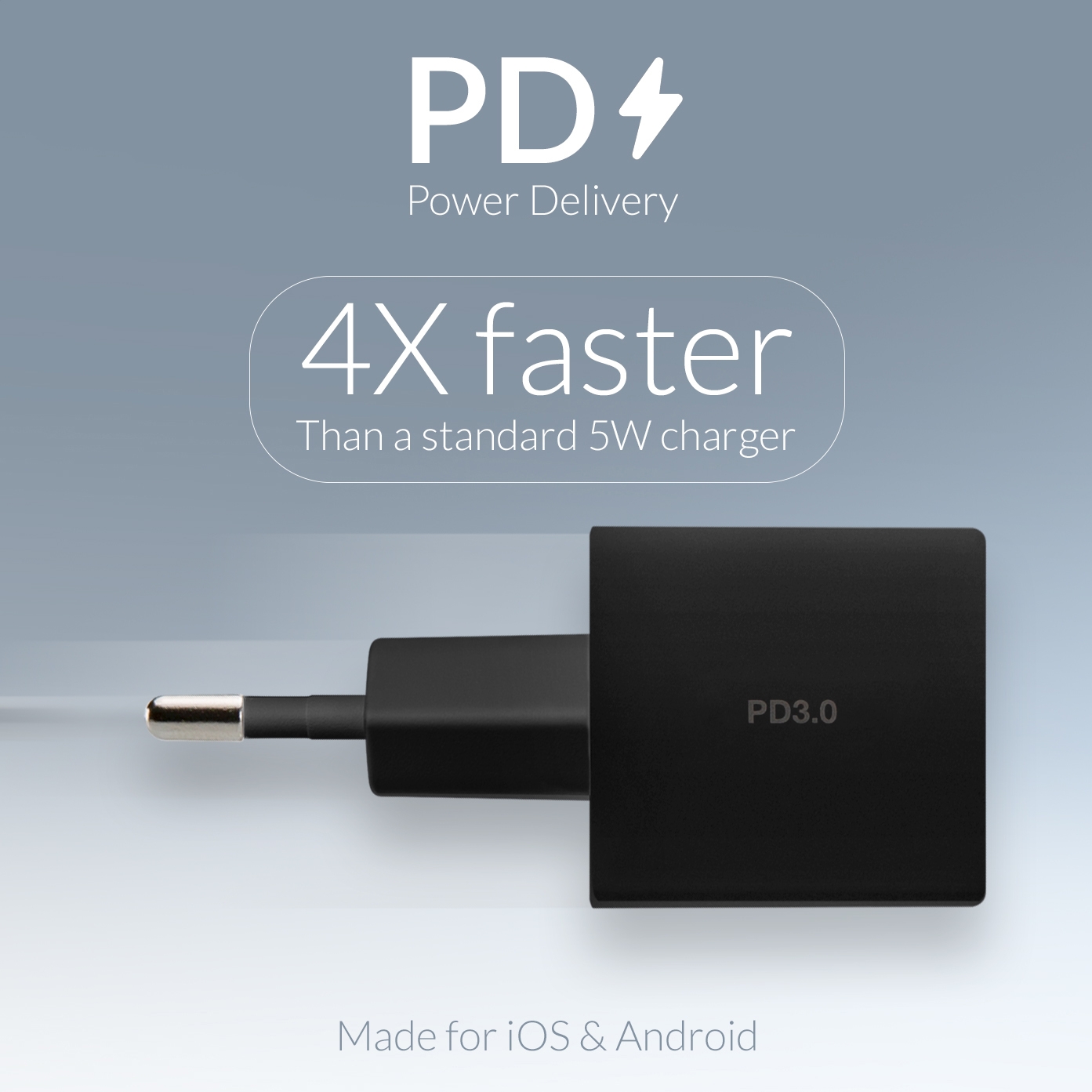USB-PD staat voor USB Power Delivery. Dit laadprotocol kan alleen worden gebruikt met USB-C connectoren en kabels. Het is een snellaadtechnologie die veel meer vermogen levert dan standaard laadtechnologieën. U kunt hiermee uw apparaat tot 70% sneller opladen dan met een standaard 5W-oplader. Uw smartphone is dus sneller tot 100 % opgeladen.