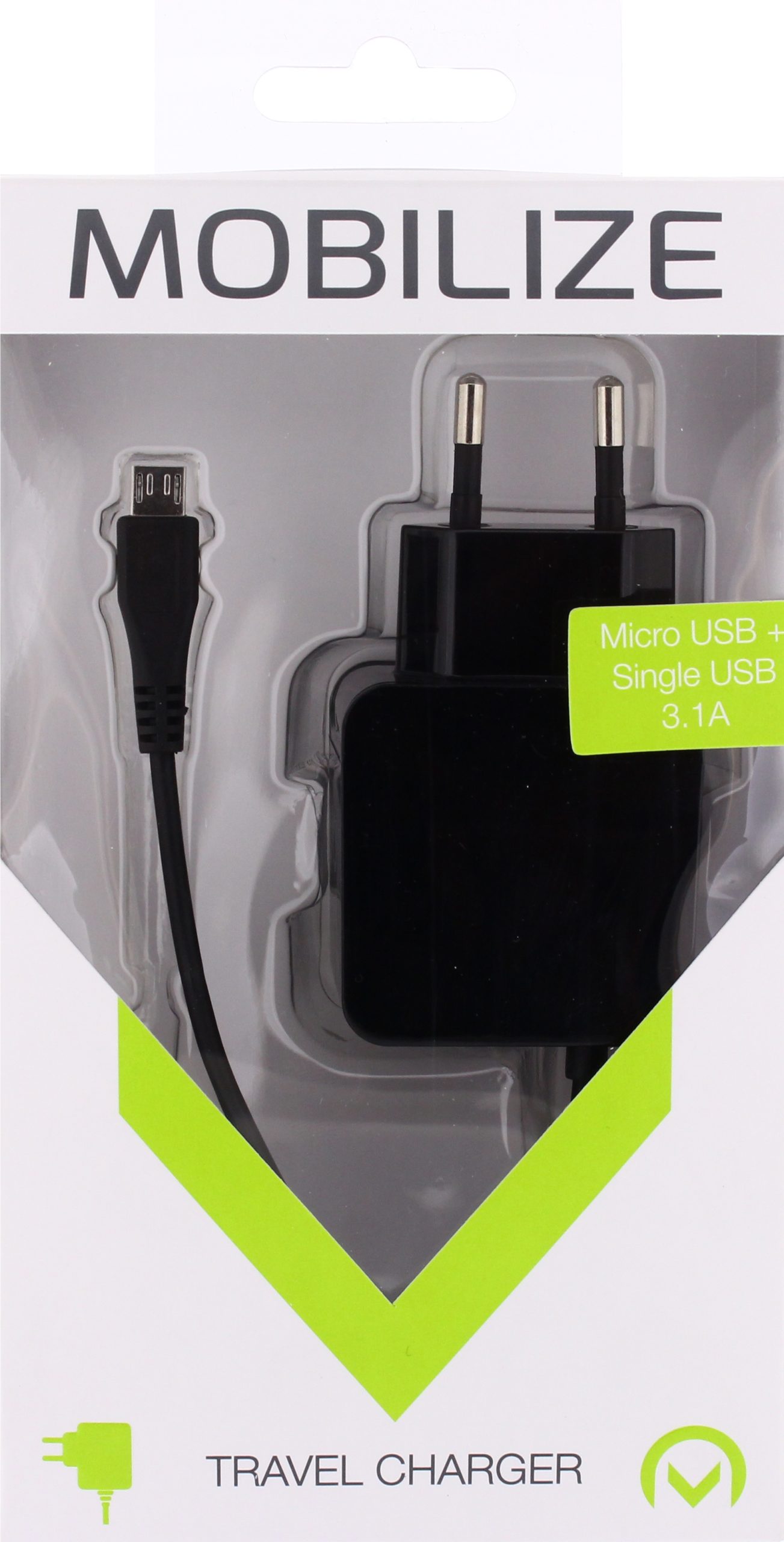 De Mobilize Travel Charger is een duurzame lader en beschikt over een vaste Micro-USB kabel met daarbij een extra USB aansluiting. Hierdoor heeft u de mogelijkheid om, naast uw toestel, nog een extra apparaat op te laden. Door simpelweg in de bovenste USB poort een eigen datakabel te pluggen en deze vervolgens op het gewenste apparaat aan te sluiten start hij vanzelf met laden. De fixed cable zorgt voor 2.1A en de USB poort voor 1.0A.