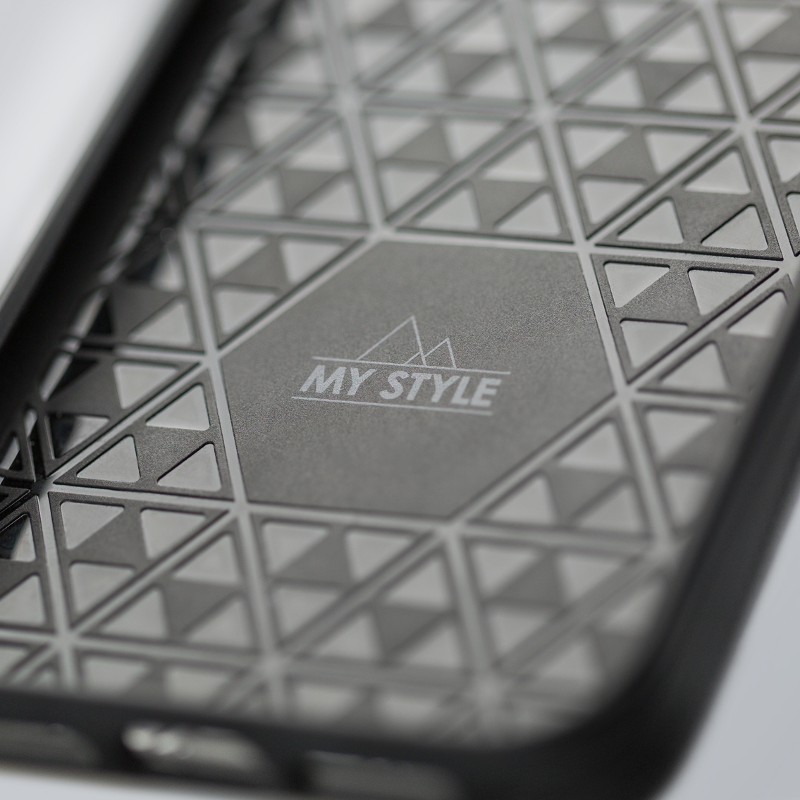 De My Style Tough case is opgebouwd uit twee materialen die elkaar versterken. De buitenkant is gemaakt van TP (polycarbonaat). Dat is een dunne, harde laag wat goed beschermd tegen krassen. De flexibele binnenkant is gemaakt van stevig TPU (Thermoplastic polyurethaan) en is bijzonder geschikt om vallen en stoten op te vangen. Het TPU loopt iets door zodat een kleine, opstaande rand ook de touchscreen van uw mobiel helpt beschermen. De Tough Case heeft een stijlvol triangle motief en Sensitive Touch knoppen met een mooie metal-look. Om uw mobiel op te laden hoeft u de case nooit te verwijderen want aan alle uitsparingen is gedacht en de case is zo dun dat draadloos opladen geen probleem is.