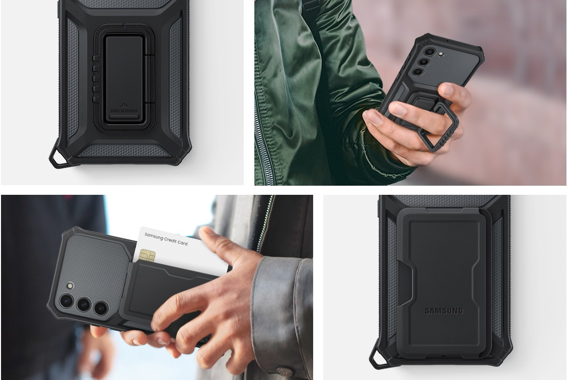 De Samsung Rugged Gadget Case is de robuuste versie van de normale gadget case. Net als de normale gadget case is deze case te combineren met diverse afneembare en uitwisselbare accessoires van allerlei verschillende merken. Zo kan je onder andere kiezen uit een afneembaar vak voor een bankpas, uitklapbare steun of extra grip. Hiernaast is de Rugged Gadget Case zo ontworpen dat het jouw toestel beschermt voor vallen vanaf een hoogte van 1,5 meter.