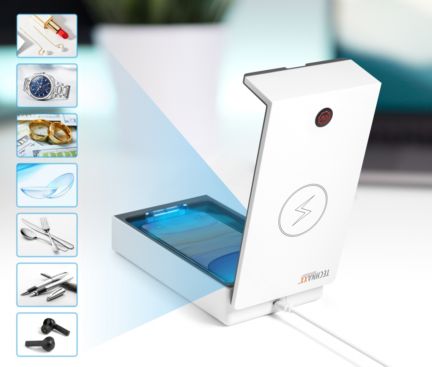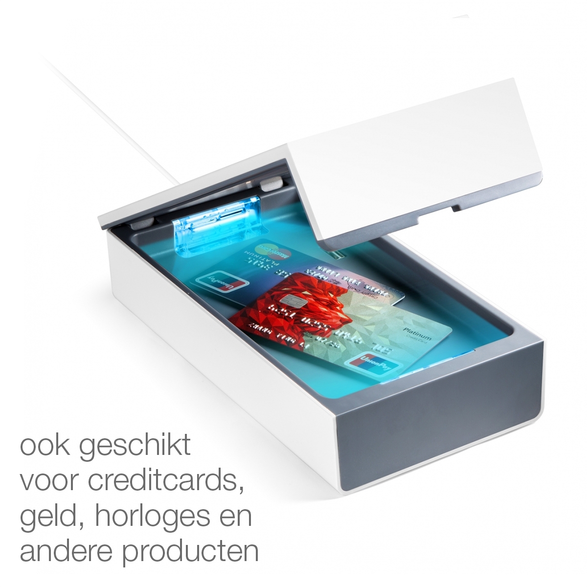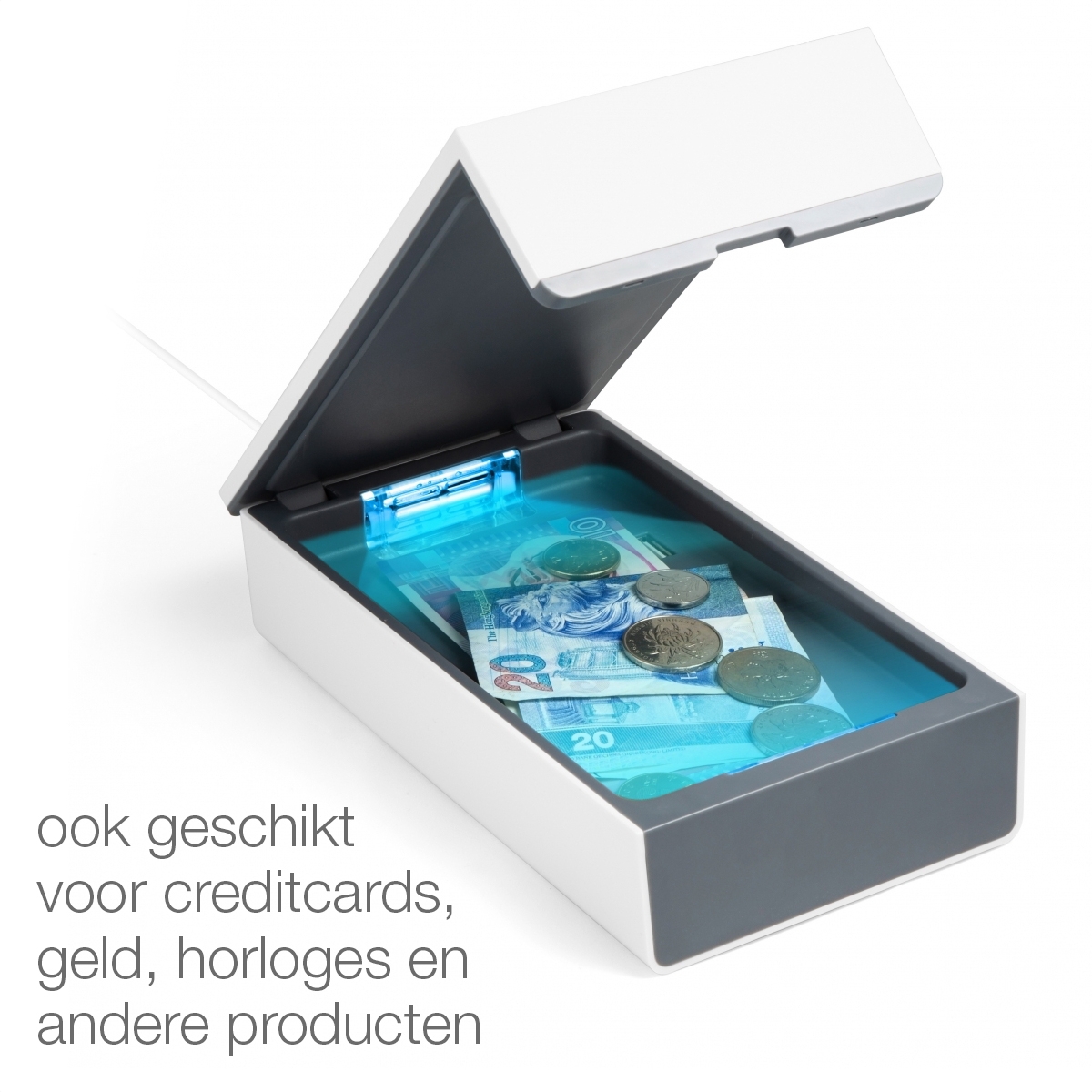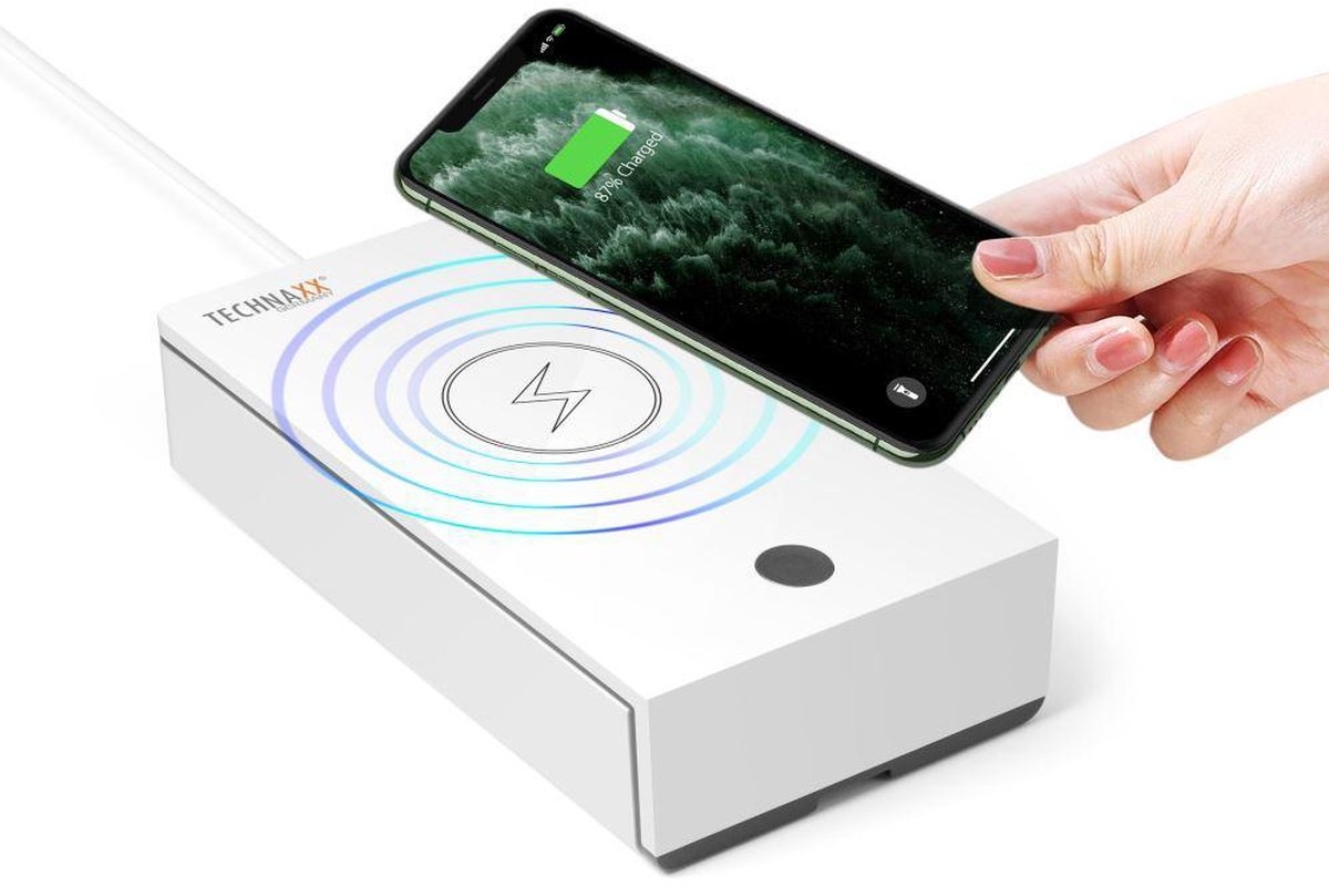 Dood vrijwel alle bacteriën en virussen met UV licht in deze UV Desinfection Box van Technaxx. Je kan jouw mobiel in de box desinfecteren, maar bijvoorbeeld ook geld, headphones, horloge, bril, creditcards en meer. In een kleine 10 minuten zijn jouw producten zo goed als bacterievrij (99,9%). Je kunt ondertussen gewoon je telefoon opladen (met kabel), ideaal dus om dat elke nacht te doen.
