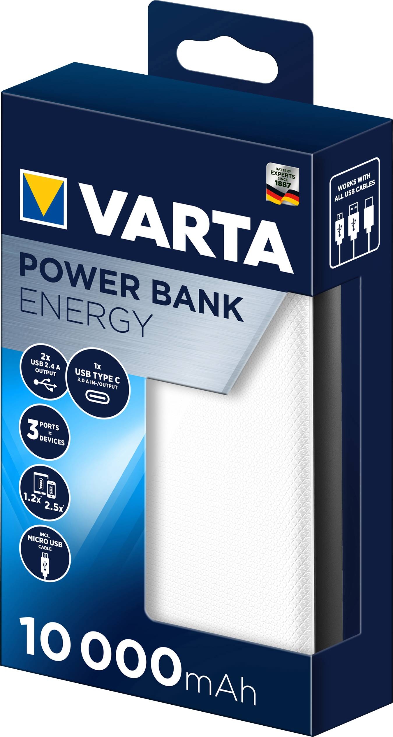 Met de Varta Power Bank Energy 10.000 mAh haal je een kleine powerhouse in huis. Dankzij de capaciteit van 10.00 mAh kan jij jouw toestel tot 2 á 3 keer opladen. Het is ook mogelijk om 3 apparaten tegelijk te laden door de aanwezigheid van 2 USB-A poorten en 1 USB-C poort.