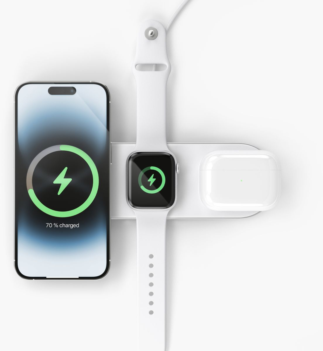Optimaal ontworpen voor Apple-apparaten, biedt de Aura Home ruimte voor jouw iPhone, Apple Watch en AirPods. Je hebt ook de flexibiliteit om een Apple Watch en twee iPhones tegelijkertijd op te laden. De geïntegreerde magneten zorgen voor de perfecte positionering van jouw apparaten tijdens het oplaadproces, zodat ze altijd veilig en stevig op hun plaats blijven.